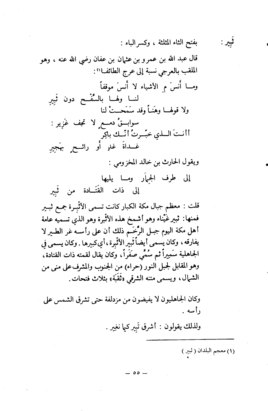 قلت: معظم جبال مكة الكبار كانت تسمى الأثْبِرة جمع ثبير فمنها: ثبير غَيْناء وهو أشمخ هذه الأثْبرة وهو الذي تسميه عامة أهل مكة اليوم جبل الرَّخَم ذلك أن على رأسه غر الطير لا يفارقه، وكان يسمى أيضاً ثَبير الأثْبِرة، أي كبيرها. وكان يسمى في الجاهلية سَميراً ثم سُمِّي صَفَراً، وكان يقال لقمته ذات القتادة، وهو المقابل لجبل النور (حراء) من الجنوب والمشرف على منى من الشمال، ويسمى متنه الشرقي "ثَقَبَة" بثلاث فتحات.