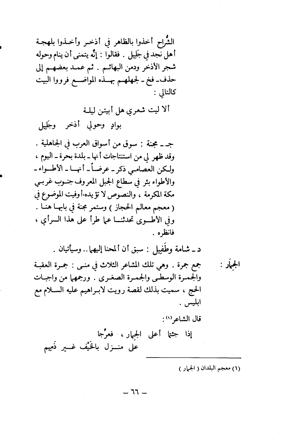 جـ- مجنة: سوق من أسواق العرب في الجاهلية. وقد ظهر لي من استنتاجات أنها -بلدة بحرة- اليوم، ولكن العصامي ذكر -عرضاً- أنها -الأطواء- والأطواء بئر في سطاع الجبل المعروف جنوب غربي مكة المكرمة، والنصوص لا تؤيده. أوفيت الموضوع في (معجم معالم الحجاز) وستمر مجنة في بابها هنا.