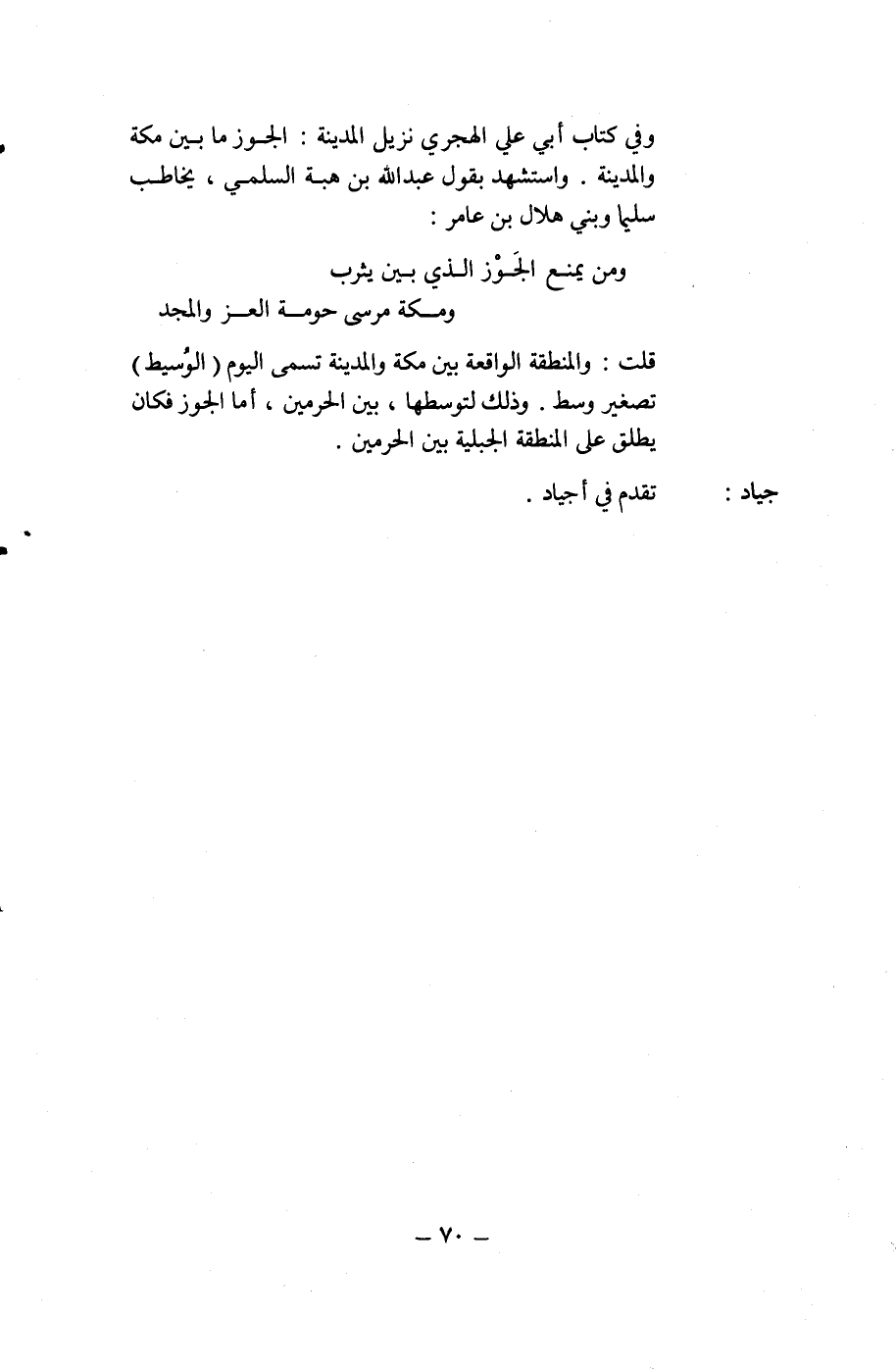 وفي كتاب أبي علي الهجري نزيل المدينة: الجوز ما بين مكة والمدينة. واستشهد بقول عبد الله بن هبة السلمي، يخاطب سليما وبني هلال بن عامر: