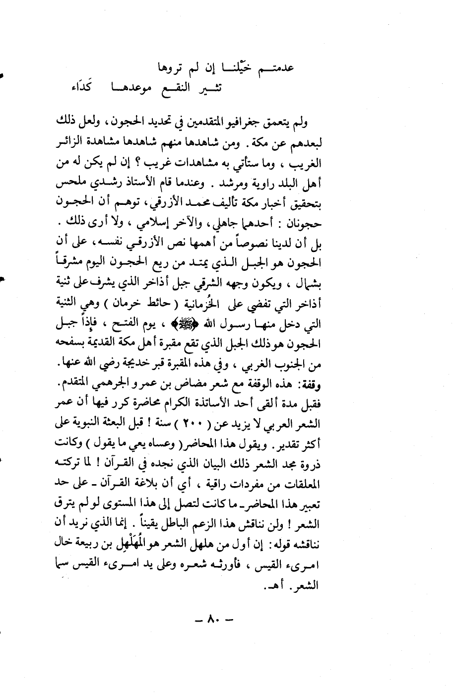 بل أن لدينا نصوصاً من أهمها نص الأزرقي نفسه، على أن الحجون هو الجبل الذي يمتد من ريم الحجون اليوم مشرقاً بشمال، ويكون وجهه الشرقي جبل أذاخر الذي يشرف على ثنية أذاخر التي تفضي على الخُرمانية (حائط خرمان) وهي الثنية التي دخل منها رسول الله - صلى الله عليه وسلم -، يوم الفتح، فإذاً جبل الحجون هو ذلك الجبل الذي تقع مقبرة أهل مكة القديمة بسفحه من الجنوب الغربي، وفي هذه المقبرة قبر خديجة رضي الله عنها. وقفة: هذه الوقفة مع شعر مضاض بن عمرو الجرهمي المتقدم. فقبل مدة ألقى أحد الأساتذة الكرام محاضرة كرر فيها أن عمر الشعر العربي لا يزيد عن (200) سنة! قبل البعثة النبوية على أكثر تقدير. ويقول هذا المحاضر (وعساه يعي ما يقول) وكانت ذروة مجد الشعر ذلك البيان الذي نجده في القرآن! لما تركته المعلقات من مفردات راقية، أي أن بلاغة القرآن -على حد تعبير هذا المحاضر- ما كانت لتصل إلى هذا المستوى لو لم يترق الشعر! ولن نناقش هذا الزعم الباطل يقيناً. إنما الذي نريد أن نناقشه قوله: ان أول من هلهل الشعر هو المُهَلْهِل بن ربيعة خال امرىء القيس، فأورثه شعره وعلى يد امرىء القيس سما الشعر. أهـ.
