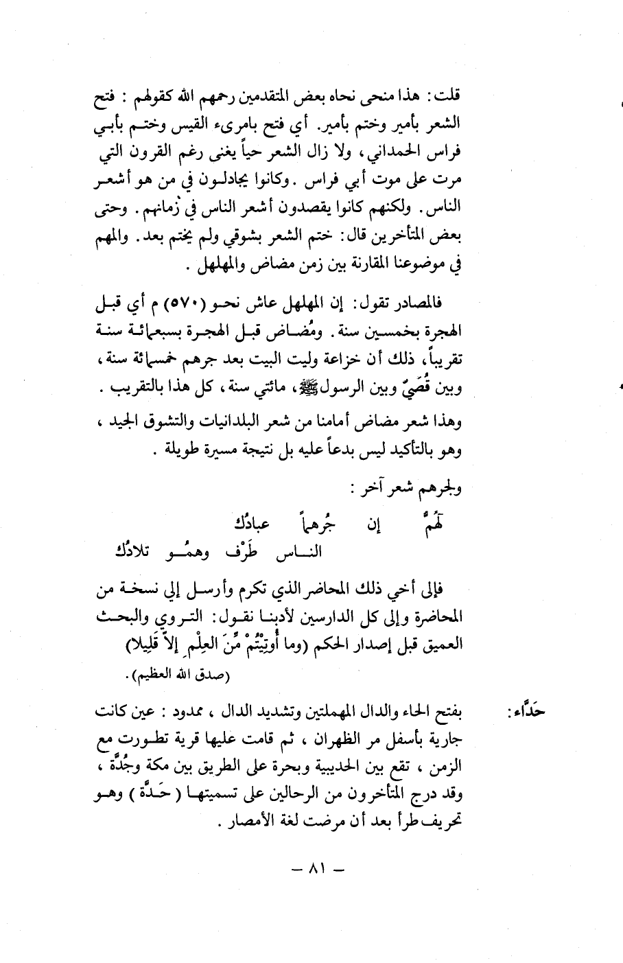 قلت: هذا منحى نحاه بعض المتقدمين رحمهم الله كقولهم: فتح الشعر بأمير وختم بأمير. أي فتح بامرىء القيس وختم بأبي فراس الحمداني، ولا زال الشعر حياً يغنى رغم القرون التي مرت على موت أبي فراس. وكانوا يجادلون في من هو أشعر الناس. ولكنهم كانوا يقصدون أشعر الناس في زمانهم. وحتى بعض المتأخرين قال: ختم الشعر بشوقي ولم يختم بعد. والمهم في موضوعنا المقارنة بين زمن مضاض والمهلهل.