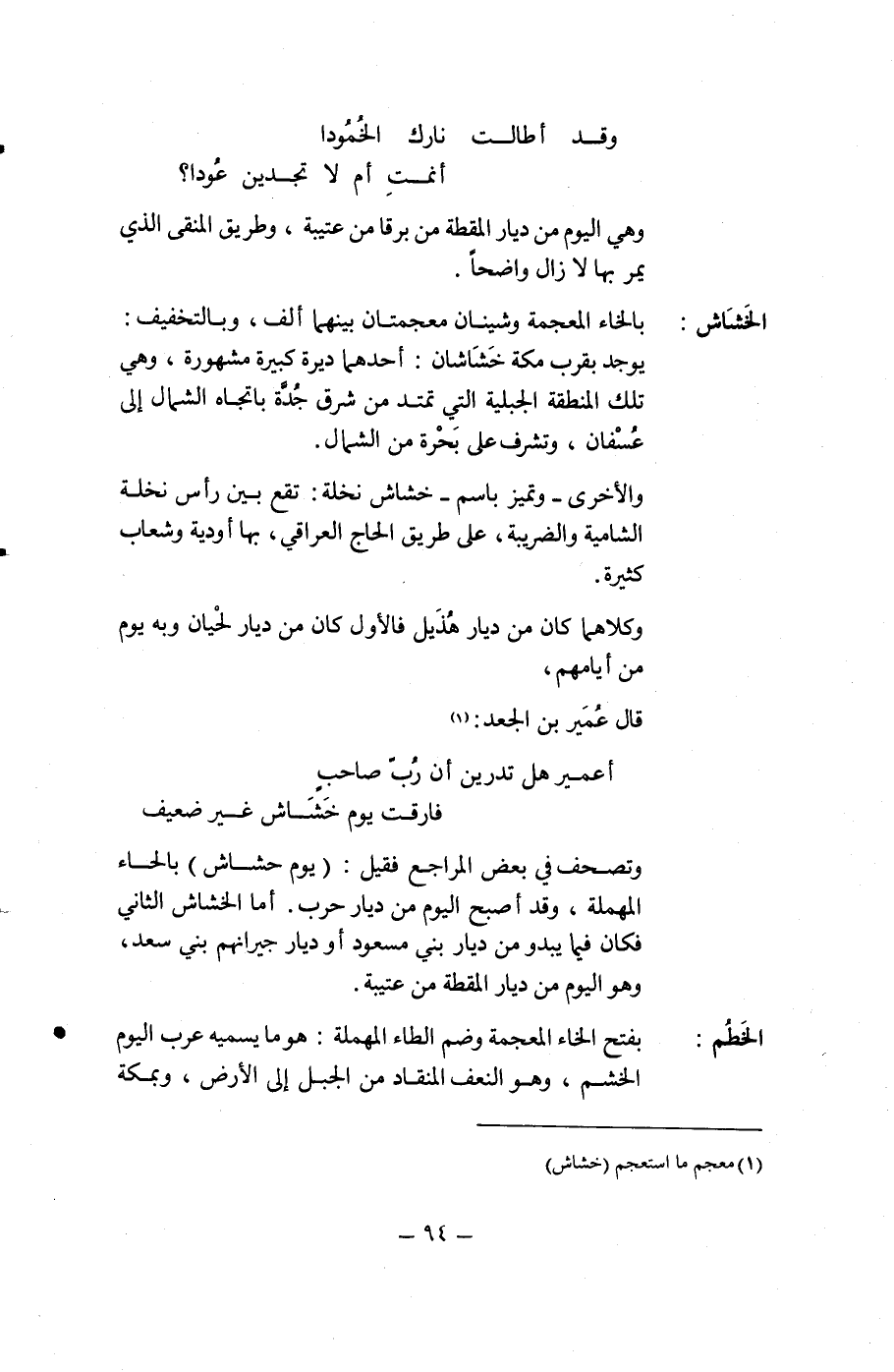 وتصحف في بعض المراجع فقيل: (يوم حشاش) بالحاء المهملة، وقد أصبح اليوم من ديار حرب. أما الخشاش الثاني فكان فيما يبدو من ديار بني مسعود أو ديار جيرانهم بني سعد، وهو اليوم من ديار المقطة من عتيبة.