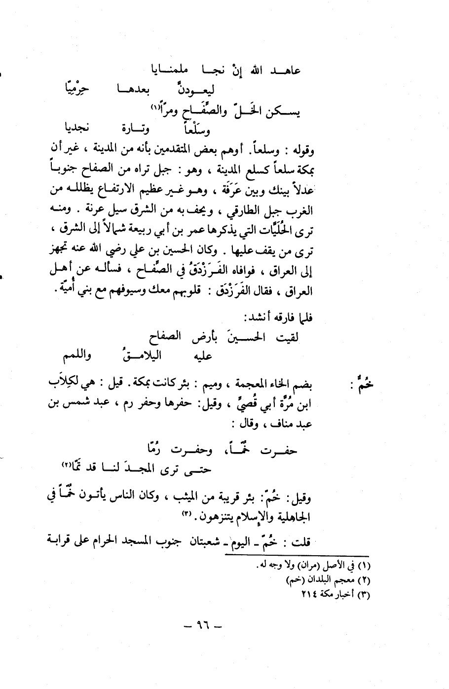 وقوله: وسلعاً. أوهم بعض المتقدمين بأنه من المدينة، غير أن بمكة سلعاً كسلع المدينة، وهو: جبل تراه من الصفاح جنوباً عدلاً بينك وبين عَرَفَة، وهو غير عظيم الارتفاع يظلله من الغرب جبل الطارقي، ويحف به من الشرق سيل عرنة. ومنه ترى الحُلَيَّات التي يذكرها عمر بن أبي ربيعة شمالاً إلى الشرق، ترى من يقف عليها. وكان الحسين بن علي رضي الله عنه تجهز إلى العراق، فوافاه الفَرَزْدَقُ في الصِّفاح، فسأله عن أهل العراق، فقال الفَرَزْدق: قلوبهم معك وسيوفهم مع بني أُميَّة.