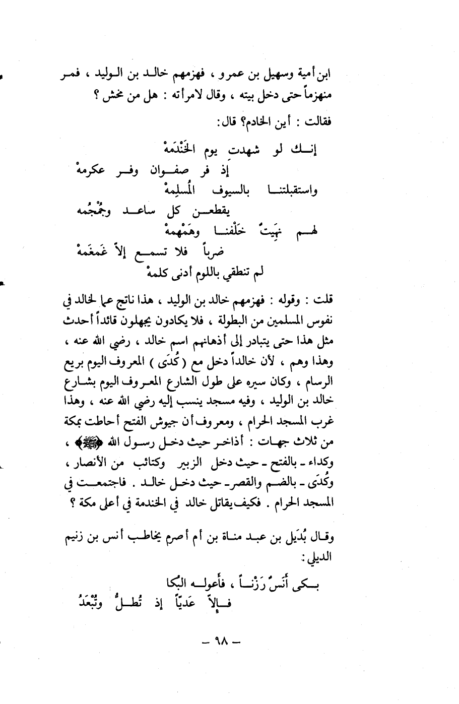 قلت: وقوله: فهزمهم خالد بن الوليد، هذا ناتج عما لخالد في نفوس المسلمين من البطولة، فلا يكادون يجهلون قائداً أحدث مثل هذا حتى يتبادر إلى أذهانهم اسم خالد، رضي الله عنه، وهذا وهم، لأن خالداً دخل مع (كُدَى) المعروف اليوم بريع الرسام، وكان سيره على طول الشارع المعروف اليوم بشارع خالد بن الوليد، وفيه مسجد ينسب إليه رضي الله عنه، وهذا غرب المسجد الحرام، ومعروف أن جيوش الفتح أحاطت بمكة من ثلاث جهات: أذاخر حيث دخل رسول الله - صلى الله عليه وسلم -، وكداء -بالفتح- حيث دخل الزبير وكتائب من الأنصار، وكُدَى -بالضم والقصر- حيث دخل خالد. فاجتمعت في المسجد الحرام. فكيف يقاتل خالد في الخندمة في أعلى مكة؟ وقال بُدَيل بن عبد مناة بن أم أصرم يخاطب أنس بن زنيم الديلي:
