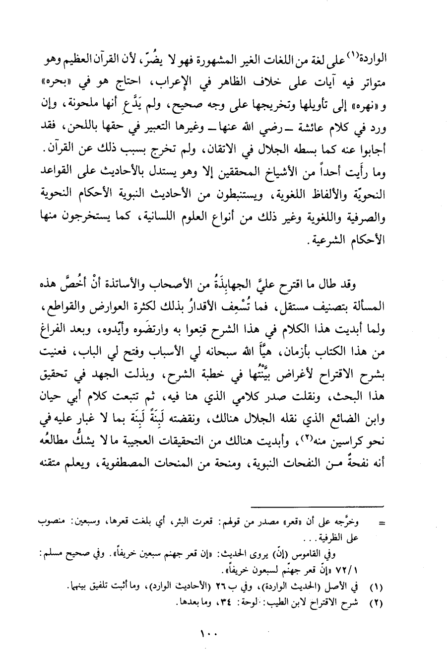 الواردة على لغة من اللغات الغير المشهورة فهو لا يضر, لأن القرآن العظيم وهو متواتر فيه آيات على خلاف الظاهر في الإعراب, احتاج هو في «بحره» و «نهره» إلى تأويلها وتخريجها على وجه صحيح, ولم يدع أنها ملحونة, وإن ورد في كلام عائشة - رضي الله عنها - وغيرها التعبير في حقها باللحن, فقد أجابوا عنه كما بسطه الجلال في الاتقان, ولم تخرج بسبب ذلك عن القرآن. وما رأيت أحدًا من الأشياخ المحققين إلا وهو يستدل بالأحاديث على القواعد النحوية والألفاظ اللغوية, ويستنبطون من الأحاديث النبوية الأحكام النحوية والصرفية واللغوية وغير ذلك من أنواع العلوم اللسانية, كما يستخرجون منها الأحكام الشرعية.