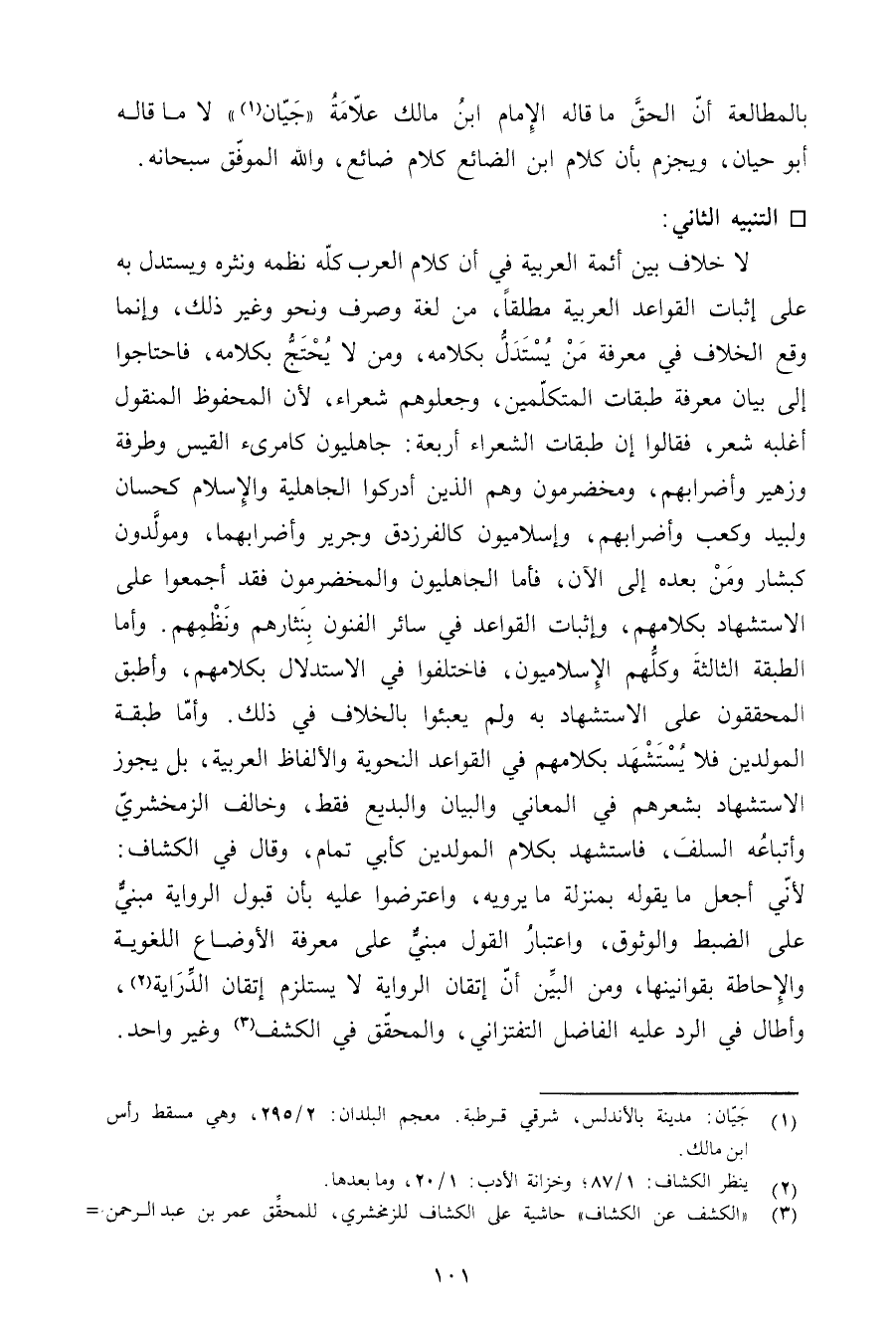 لا خلاف بين أئمة العربية في أن كلام العرب كله نظمه ونثره ويستدل به على إثبات القواعد العربية مطلقًا, من لغة وصرف ونحو وغير ذلك, وإنما وقع الخلاف في معرفة من يستدل بكلامه, ومن لا يحتج بكلامه, فاحتاجوا إلى بيان معرفة طبقات المتكلمين, وجعلوهم شعراء, لأن المحفوظ المنقول أغلبه شعر, فقالوا إن طبقات الشعراء أربعة: جاهليون كامرئ القيس وطرفة وزهير وأضرابهم, ومخضرمون وهم الذين أدركوا الجاهلية والإسلام كحسان ولبيد وكعب وأضرابهم, وإسلاميون كالفرزدق وجرير وأضرابهما, ومولدون كبشار ومن بعده إلى الآن, فأما الجاهليون والمخضرمون فقد أجمعوا على الاستشهاد بكلامهم, وإثبات القواعد في سائر الفنون بنثارهم ونظمهم. وأما الطبقة الثالثة وكلهم الإسلاميون, فاختلفوا في الاستدلال بكلامهم, وأطبق المحققون على الاستشهاد ولم يعبئوا بالخلاف في ذلك. وأما طبقة المحققون على الاستشهاد بكلامهم في القواعد النحوية والألفاظ العربية, بل يجوز الاستشهاد بشعرهم في المعاني والبيان والبديع فقط, وخالف الزمخشري وأتباعه السلف, فاستشهد بكلام المولدين كأبي تمام, وقال في الكشاف: لأني أجعل ما يقوله بمنزلة ما يرويه, واعترضوا عليه بأن قبول الرواية مبني على الضبط والوثوق, واعتبار القول مبني على معرفة الأوضاع اللغوية والإحاطة بقوانينها, ومن البين أن إتقان الرواية لا يستلزم إتقانالدراية, وأطال في الرد عليه الفاضل التفتزاني, والمحقق في الكشف وغير واحد.