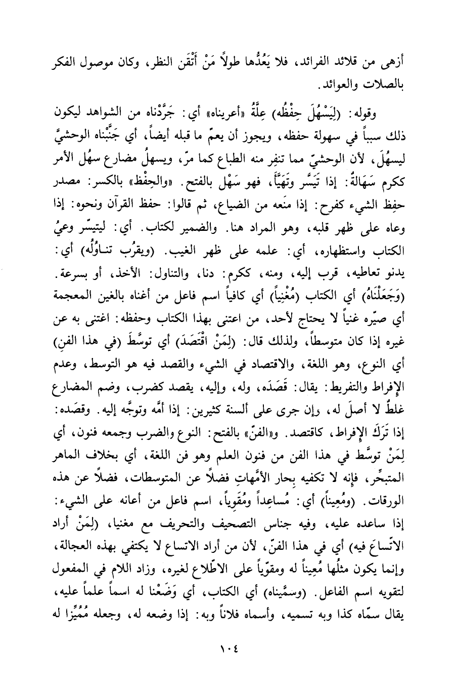 وقوله: (ليسهل حفظه) علة «أعريناه» أي: جردناه من الشواهد ليكون ذلك سببًا في سهولة حفظه, ويجوز أن يعم ما قبله أيضًا, أي جنبناه الوحشي ليسهل, لأن الوحشي مما تنفر منه الطباع كما مر, ويسهل مضارع سهل الأمر ككرم سهالة: إذا تيسر وتهيأ, فهو سهل بالفتح. «والحفظ» بالكسر: مصدر حفظ الشيء كفرح: إذا منعه من الضياع, ثم قالوا: حفظ القرآن ونحوه: إذا وعاه على ظهر قلبه, وهو المراد هنا: والضمير لكتاب. أي: ليتيسر وعي الكتاب واستظهاره, أي: علمه على ظهر الغيب. (ويقرب تناوله) أي: يدنو تعاطيه, قرب إليه, ومنه, ككرم: دنا, والتناول: الأخذ, أو بسرعة. (وجعلناه) أي الكتاب (مغنيًا) أي كافيًا اسم فاعل من أغناه بالغين المعجمة أي صيره غنيًا لا يحتاج لأحد, من اعتنى بهذا الكتاب وحفظه: اغتنى به عن غيره إذا كان متوسطًا, ولذلك قال: (لمن اقتصد) أي توسط (في هذا الفن) أي النوع, وهو اللغة, والاقتصاد في الشيء والقصد فيه هو التوسط, وعدم الإفراط والتفريط: يقال: قصده, وله, وإليه, يقصد كضرب, وضم المضارع غلط لا أصل له, وإن جرى على ألسنة كثيرين: إذا أمه وتوجه إليه. وقصده: إذا ترك الإفراط, كاقتصد. و «الفن» بالفتح: النوع والضرب وجمعه فنون, أي لمن توسط في هذا الفن من فنون العلم وهو فن اللغة, أي بخلاف الماهر المتبحر, فإنه لا تكفيه بحار الأمهات فضلًا عن المتوسطات, فضلًا عن هذه الورقات. (ومعينًا) أي: مساعدًا ومقويًا, اسم فاعل من أعانه على الشيء: إذا ساعده عليه, وفيه جناس التصحيف والتحريف مع مغنيا, (لمن أراد الاتساع فيه) أي في هذا الفن, لأن من أراد الاتساع لا يكتفي بهذه العجالة, وإنما يكون مثلها معينًا له ومقويًا على الاطلاع لغيره, وزاد اللام في المفعول لتقويه اسم الفاعل. (وسميناه) أي الكتاب, أي وضعنا له اسمًا علمًا عليه, يقال سماه كذا وبه تسميه, وأسماه فلانًا وبه: إذا وضعه له, وجعله مميزًا له