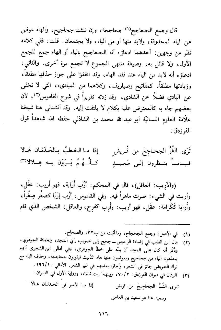 وقال وجمع الجحاجح جحاجحة, وإن شئت جحاجيح, والهاء عوض عن الياء المحذوفة, ولابد منها أو من الياء, ولا يجتمعان. قلت: ففي كلامه نظر من وجهين: أحدهما ادعاؤه أنه الجحاجيح بالياء أو الهاء جمع للجمع الأول, ولا قائل به, وصيغة منتهى الجموع لا تجمع مرة أخرى. والثاني: ادعاؤه أنه لابد من الياء عند فقد الهاء, وقد اتفقوا على جواز حذفها مطلقًا, وزيادتها مطلقًا, كمفاتيح وصياريف, وكلاهما من المبادئ, التي لا تخفى عن البادي فضلًا عن الشادي, وقد زدته تقريرًا في شرح القاموس, لأن بعضهم جاء به كالمعترض عليه بكلام لا يلتفت إليه. وقد أنشدني هنا شيخنا علامة العلوم اللسانية أبو عبد الله محمد بن الشاذلي حفظه الله شاهدًا قول الفرزدق: