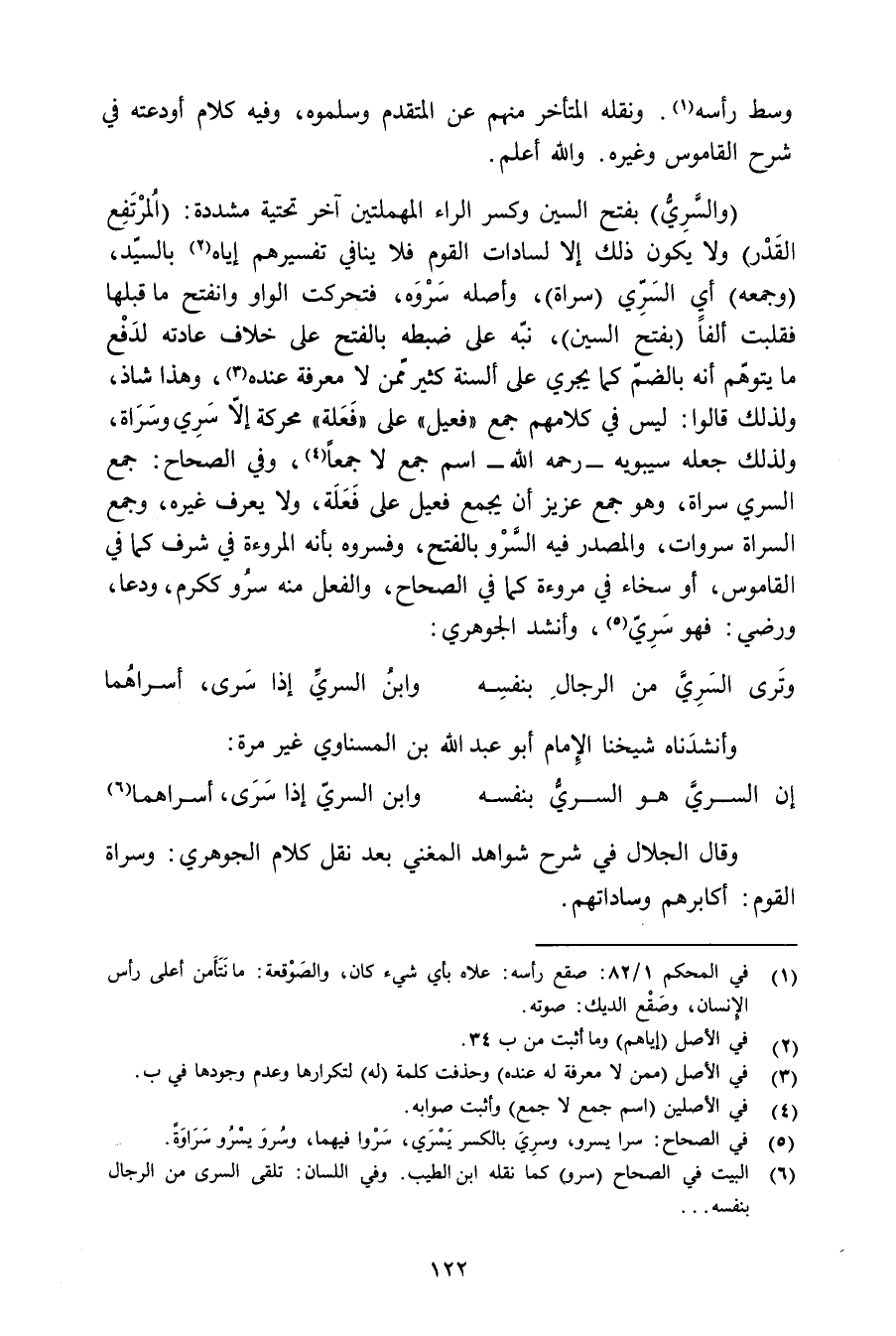 وقال الجلال في شرح شواهد المغني بعد نقل كلام الجوهري: وسراة القوم: أكابرهم وساداتهم.