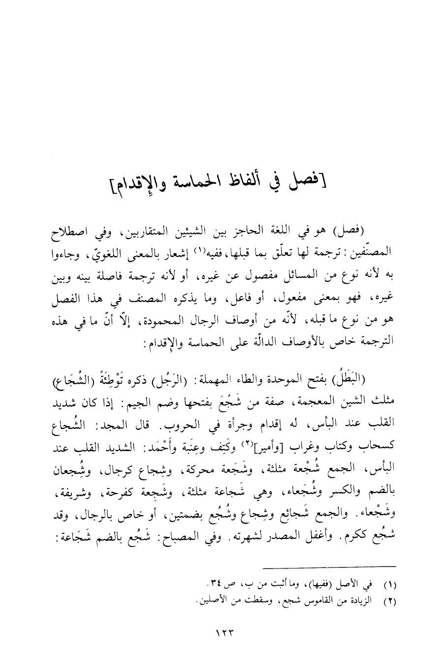 (فصل) هو في اللغة الحاجز بين الشيئين المتقاربين, وفي اصطلاح المصنفين: ترجمة لها تعلق بما قبلها, ففيه إشعار بالمعنى اللغوي, وجاءوا به لأنه نوع من المسائل مفصول عن غيره, أو لأنه ترجمة فاصلة بينه وبين غيره, فهو بمعنى مفعول, أو فاعل, وما يذكره المصنف في هذا الفصل هو من نوع ما قبله, لأنه من أوصاف الرجال المحمودة, إلا أن ما في هذه الترجمة خاص بالأوصاف الدالة على الحماسة والإقدام: