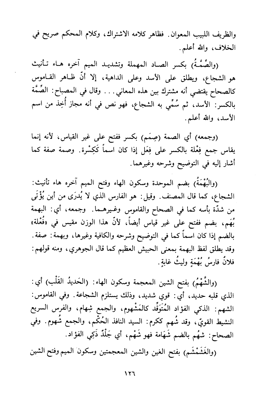 (والصمة) بكسر الصاد المهملة وتشديد الميم آخره هاء تأنيث هو الشجاع, ويطلق على الأسد وعلى الداهية, إلا أن ظاهر القاموس كالصحاح يقتضي أنه مشترك بين هذه المعاني ... وقال في المصباح: الصمة بالكسر: الأسد, ثم سمي به الشجاع, فهو نص في أنه مجاز أخذ من اسم الأسد, والله أعلم.