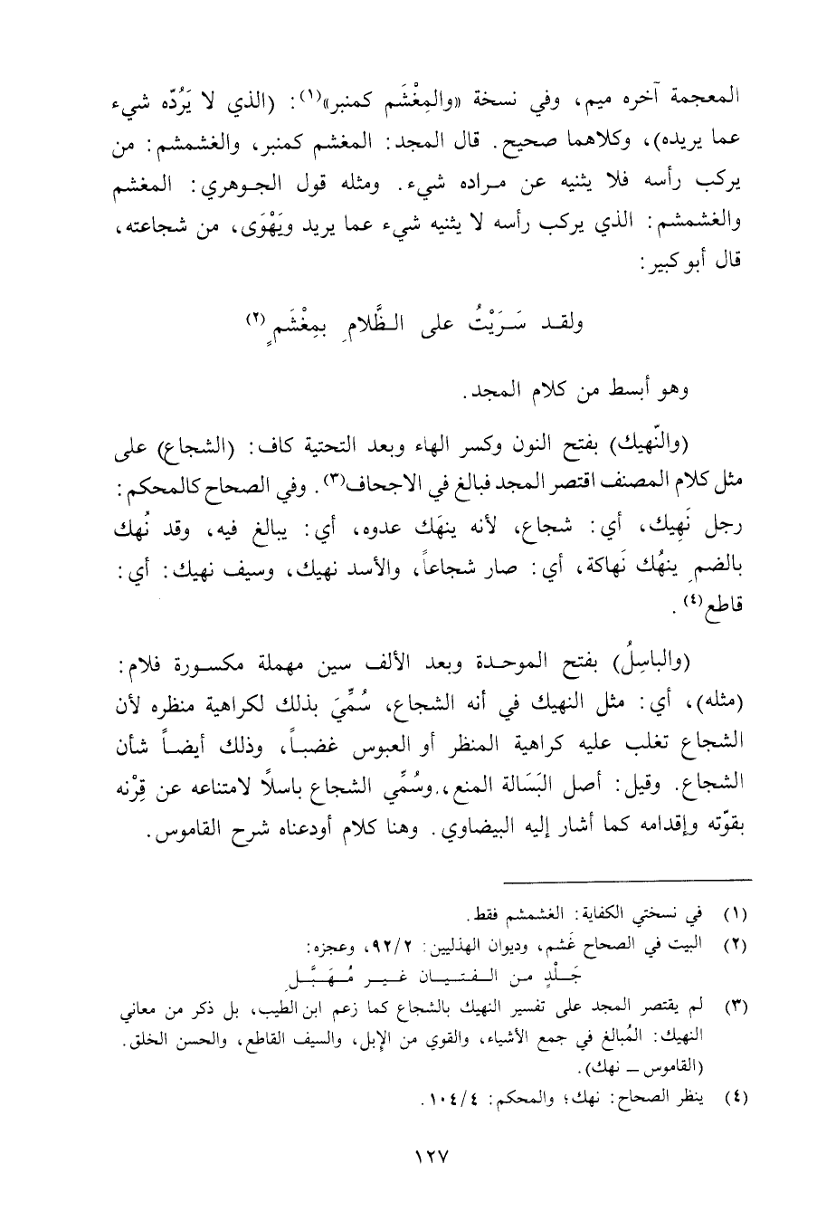 المعجمة آخره ميم, وفي نسخة «والمغشم كمنبر»: (الذي لا يرده شيء عما يريده) , وكلاهما صحيح. قال المجد: المغشم كمنبر, والغشمشم: من يركب رأسه فلا يثنيه عن مراده شيء. ومثله قول الجوهري: المغشم والغشمشم: الذي يركب رأسه لا يثنيه شيء عما يريد ويهوى, من شجاعته, قال أبو كبير:
