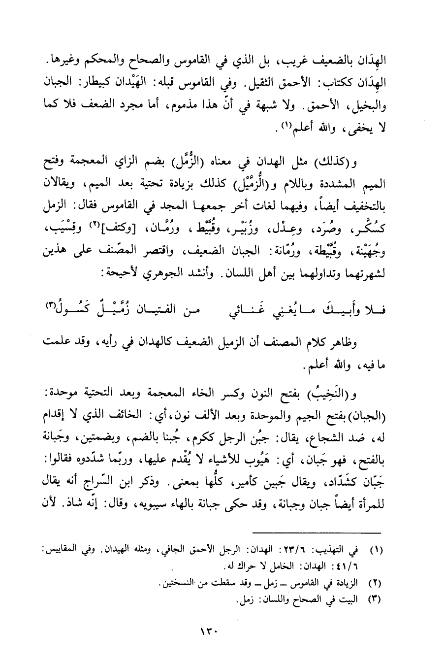 و(كذلك) مثل الهدان في معناه (الزمل) بضم الزاي المعجمة وفتح الميم المشددة وباللام و (الزميل) كذلك بزيادة تحتية بعد الميم, ويقالان بالتخفيف أيضًا, وفيهما لغات أخر جمعها المجد في القاموس فقال: الزمل كسكر, وصرد, وعدل, وزبير, وقبيط, ورمان, [وكتف] وقسيب, وجهينة, وقبيطة, ورمانة: الجبان الضعيف, واقتصر المصنف على هذين لشهرتهما وتداولوهما بين أهل اللسان. وأنشد الجوهري لأحيحة: