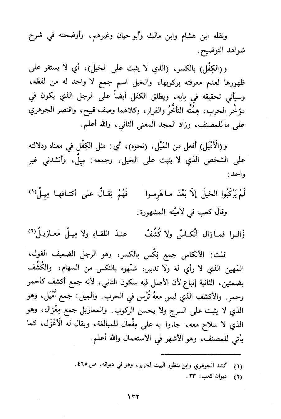 قلت: الأنكاس جمع نكس بالكسر, وهو الرجل الضعيف القول, المهين الذي لا رأي له ولا تدبير, شبهوه بالنكس من السهام, والكشف بضمتين, الثانية إتباع لأن الأصل فيه سكون الثاني, لأنه جمع أكشف كأحمر وحمر. والأكشف الذي ليس معه ترس في الحرب. والميل: جمع أميل, وهو الذي لا يثبت على السرج ولا يحسن الركوب. والمعازيل جمع معزال, وهو الذي لا سلاح معه, جاءوا به على مفعال للمبالغة, ويقال له الأعزل, كما يأتي للمصنف, وهو الأشهر في الاستعمال والله أعلم.