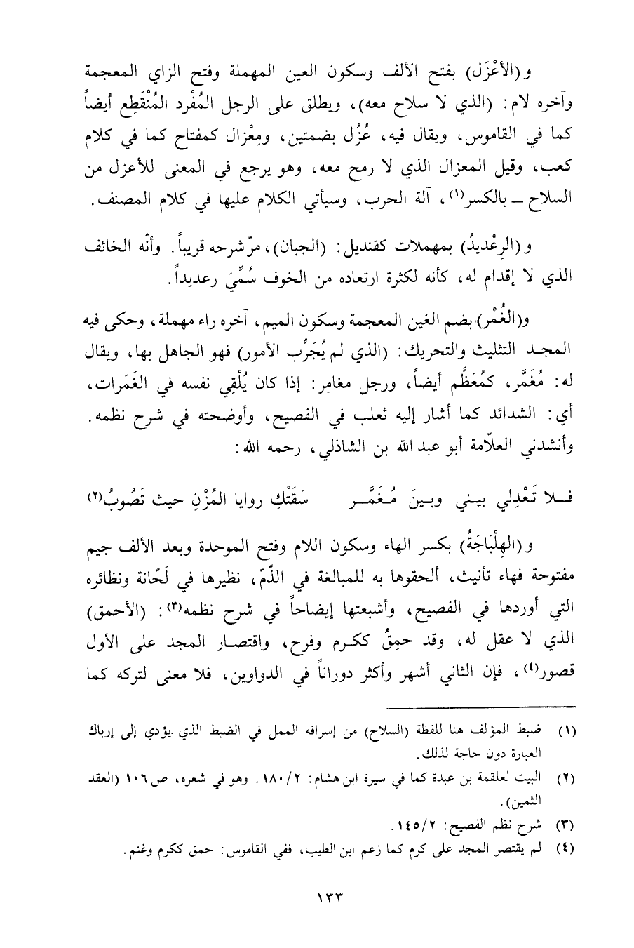 و (الأعزل) بفتح الألف وسكون العين المهملة وفتح الزاي المعجمة وآخره لام: (الذي لا سلاح معه) , ويطلق على الرجل المفرد المنقطع أيضًا كما في القاموس, ويقال فيه, عزل بضمتين, ومعزال كمفتاح كما في كلام كعب, وقيل المعزال الذي لا رمح معه, وهو يرجع في المعنى للأعزل من السلاح - بالكسر, آلة الحرب, وسيأتي الكلام عليها في كلام المصنف.