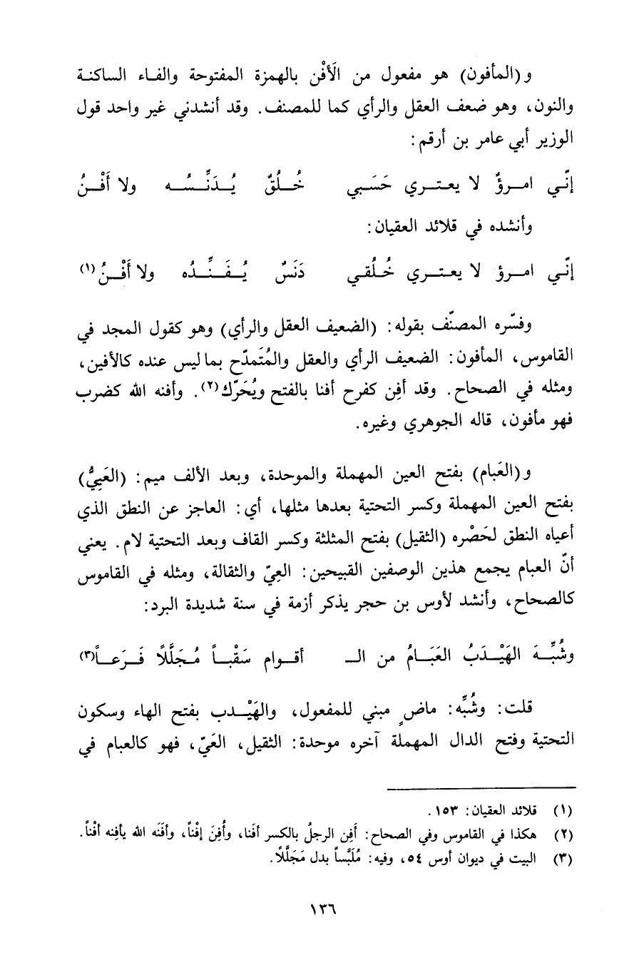 و (المأفون) هو مفعول من الأفن بالهمزة المفتوحة والفاء الساكنة والنون, وهو ضعف العقل والرأي كما للمصنف. وقد أنشدني غير واحد قول الوزير أبي عامر بن أرقم: