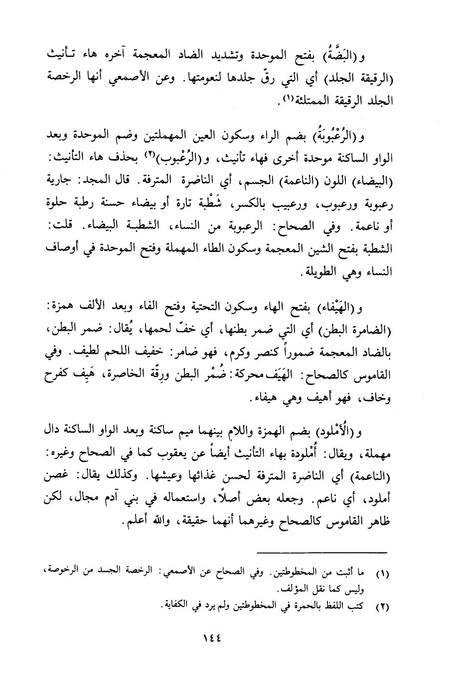 و (البضة) بفتح الموحدة وتشديد الضاد المعجمة آخره هاء تأنيث (الرقيقة الجلد) أي التي رق جلدها لنعومتها. وعن الأصمعي أنها الرخصة الجلد الرقيقة الممتلئلة.