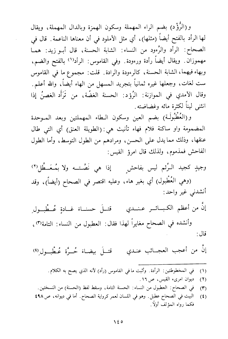 وقال الآمدي في الموازنة: الرؤد: الحسنة الغصة, من ترأد الغصن إذا انثنى لينًا لكثر مائه وغضاضته.