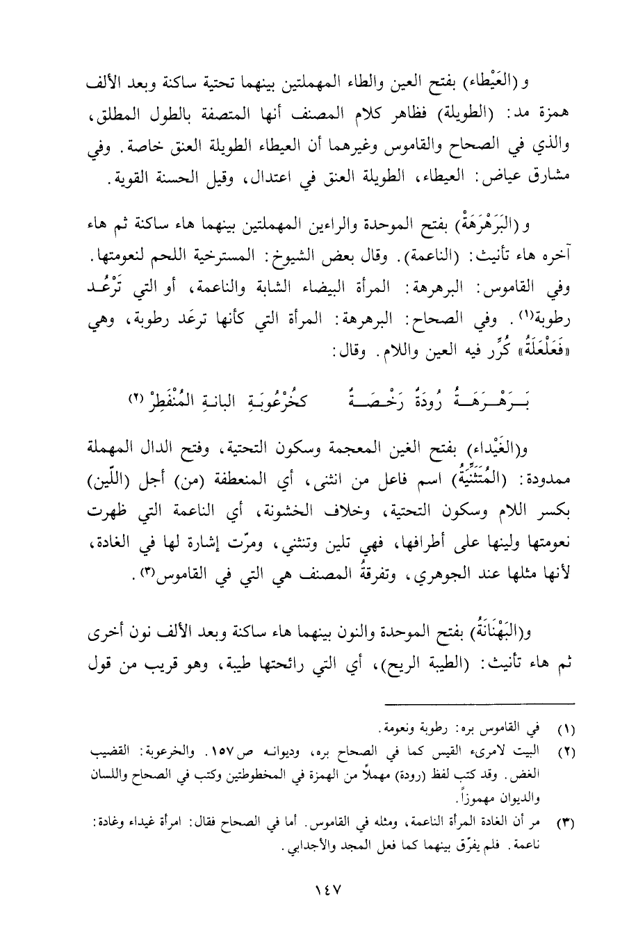 و(البرهرهة) بفتح الموحدة والراءين المهملتين بينهما هاء ساكنة ثم هاء آخره هاء تأنيث: (الناعمة). وقال بعض الشيوخ: المسترخية اللحم لنعومتها. وفي القاموس: البرهرهة: المرأة البيضاء الشابة والناعمة, أو التي ترعد رطوبة. وفي الصحاح: البرهرهة: المرأة التي كأنها ترعد رطوبة, وهي «فعلعلة» كرر فيه العين واللام. وقال:
