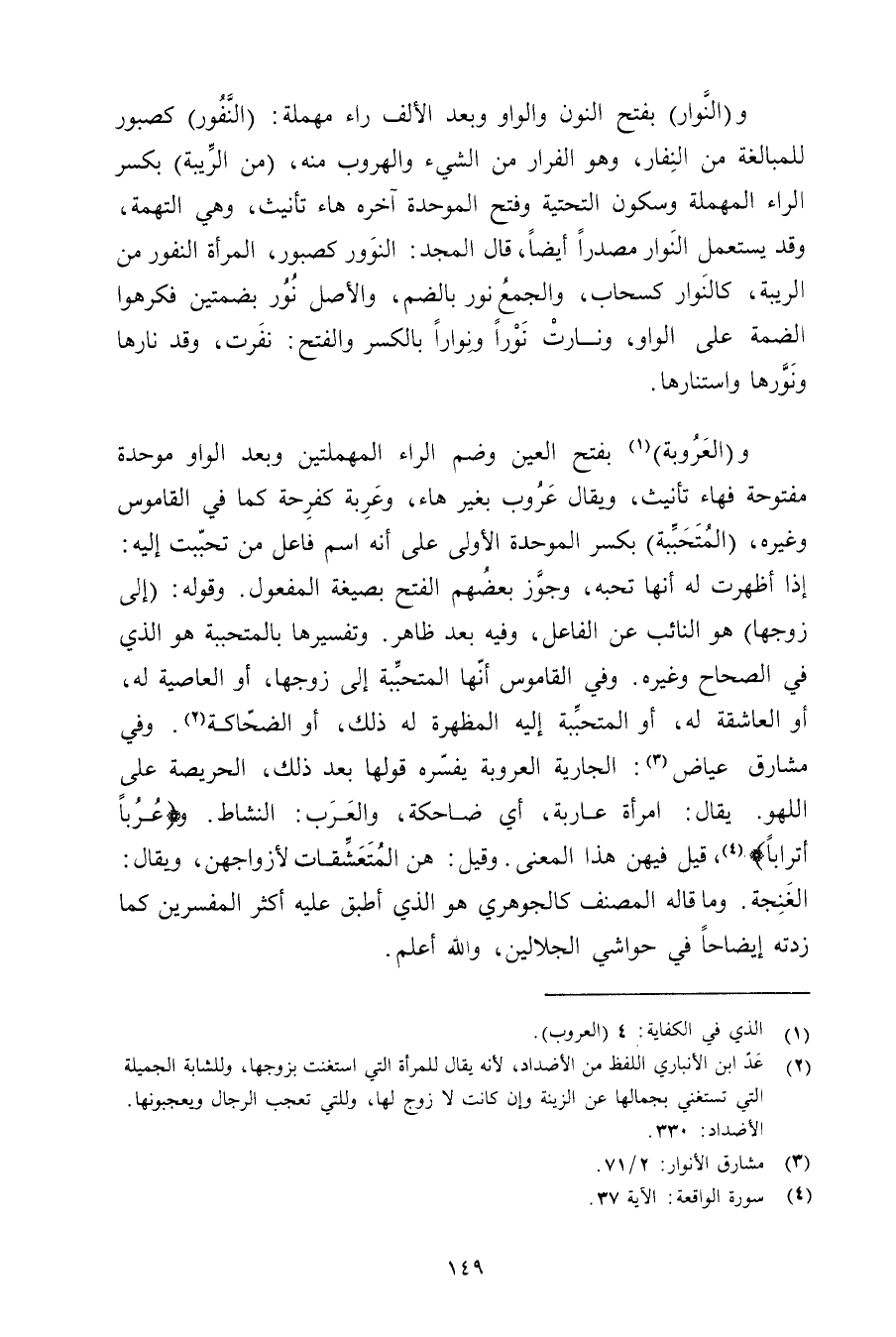 و (النوار) بفتح النون والواو وبعد الألف راء مهملة: (النفور) كصبور للمبالغة من النفار, وهو الفرار من الشيء والهروب منه, (من الربية) بكسر الراء المهملة وسكون التحتية وفتح الموحدة آخره هاء تأنيث, وهي التهمة, وقد يستعمل النوار مصدرًا أيضًا, قال المجد: النوور كصبور, المرأة النفور من الريبة, كالنوار كسحاب, والجمع نور بالضم, والأصل نور بضمتين فكرهوا الضمة على الواو, ونارت نورًا ونوارًا بالكسر والفتح: نفرت, وقد نارها ونورها واستنارها.