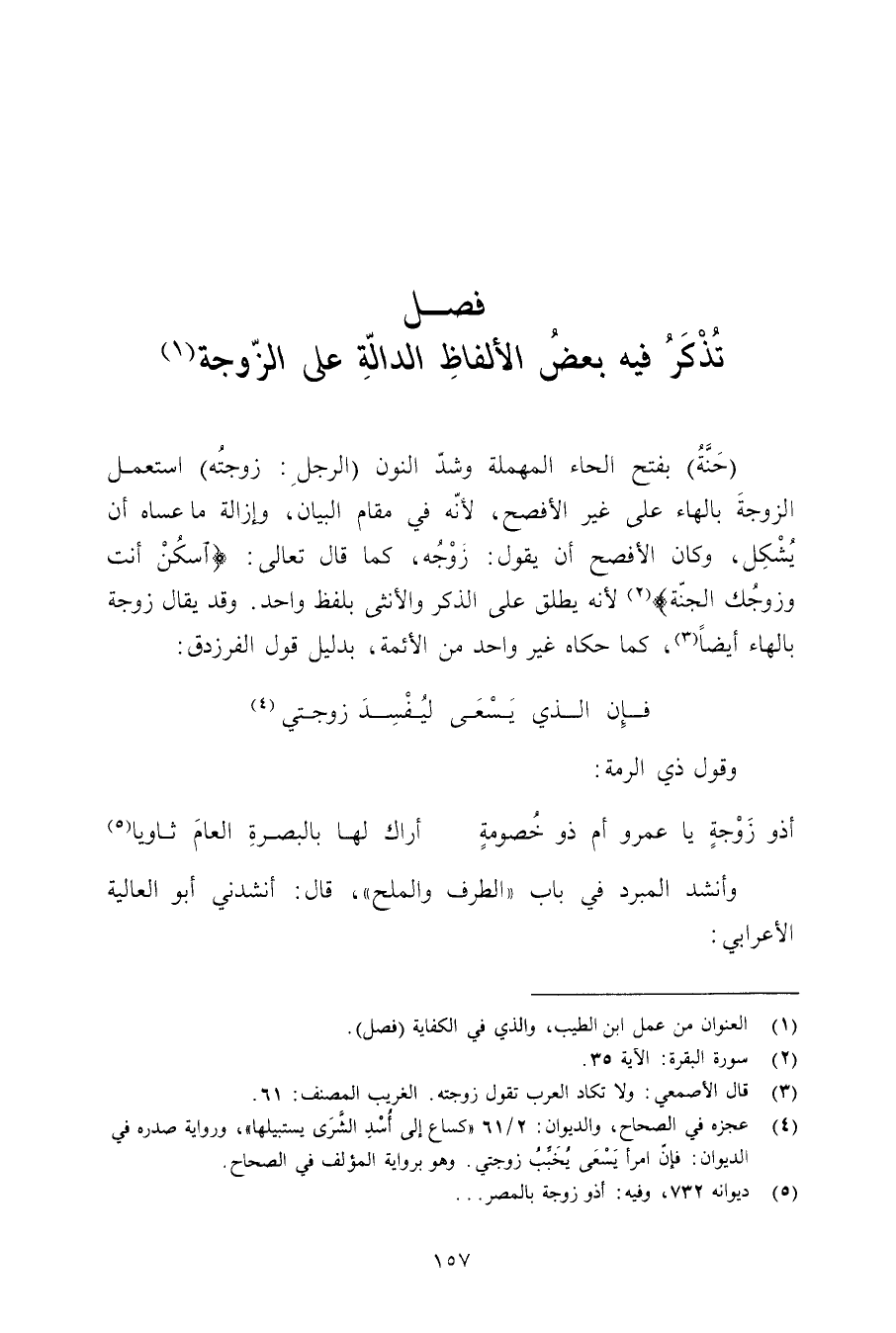 (حنة) بفتح الحاء المهملة وشد النون (الرجل: زوجته) استعمل الزوجة بالهاء على غير الأفصح, لأنه في مقام البيان, وإزالة ما عساه أن يشكل, وكان الأفصح أن يقول: زوجه, كما قال تعالى: {اسكن أنت وزوجك الجنة} لأنه يطلق على الذكر والأنثى بلفظ واحد. وقد يقال زوجة بالهاء أيضًا, كما حكاه غير واحد من الأئمة, بدليل قول الفرزدق: