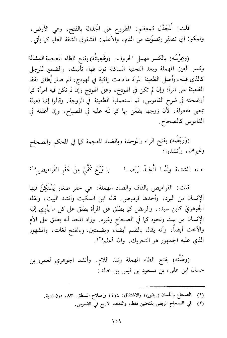قلت: القراميص بالقاف والصاد المهملة: هي حفر صغار يستكن فيها الإنسان من البرد, وأحدها قرموص. قاله ابن السكيت وأنشد البيت, ونقله الجوهري كابن سيده. والربض كما يطلق على المرأة يطلق على كل ما يأوي إليه الإنسان من بيت ونحوه كما في الصحاح وغيره. وزاد المجد أنه يطلق على الأم والأخت أيضًا, وأنه يقال بالضم أيضًا, وبضمتين, وبالفتح لغات, والمشهور الذي عليه الجمهور هو التحريك, والله أعلم.