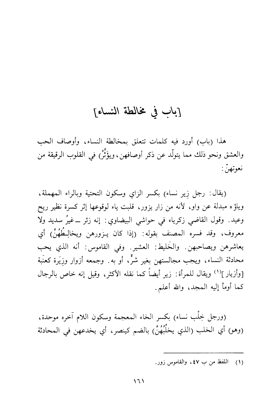 هذا (باب) أورد فيه كلمات تتعلق بمخالطة النساء, وأوصاف الحب والعشق ونحو ذلك مما يتولد عن ذكر أوصافهن, ويؤثر) في القلوب الرقيقة من نعوتهن: