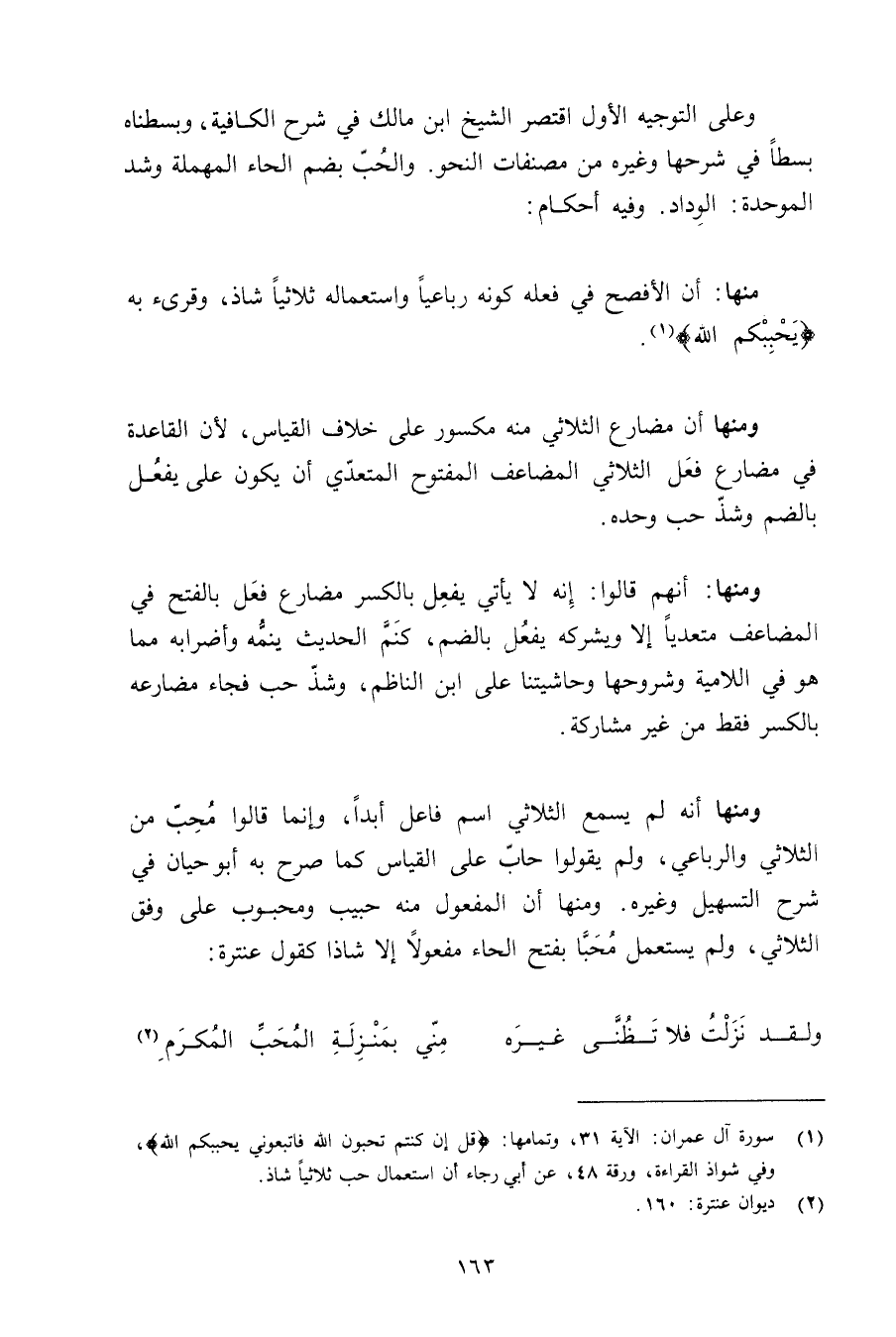 ومنها أنه لم يسمع الثلاثي اسم فاعل أبدًا, وإنما قالوا محب من الثلاثي والرباعي, ولم يقولوا حاب على القياس كما صرح به أبو حيان في شرح التسهيل وغيره. ومنها أن المفعول منه حبيب ومحبوب على وفق الثلاثي, ولم يستعمل محبًا بفتح الحاء مفعولًا إلا شاذًا كقول عنترة: