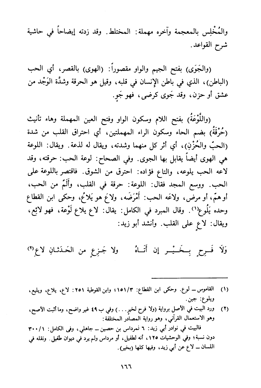 (واللوعة) بفتح اللام وسكون الواو وفتح العين المهملة وهاء تأنيث (حرقة) بضم الحاء وسكون الراء المهملتين, أي احتراق القلب من شدة (الحب والحزن) , أي أثر كل منهما وشدته, ويقال له لذعة. ويقال: اللوعة هي الهوى أيضًا يقابل بها الجوى. وفي الصحاح: لوعة الحب: حرقته, وقد لاعه الحب يلوعه, والتاع فؤاده: احترق من الشوق. فاقتصر باللوعة على الحب. ووسع المجد فقال: اللوعة: حرقة في القلب, وألم من الحب, أو هم, أو مرض, ولاعه الحب: أمرضه, ولاع هو يلاع, وحكى ابن القطاع وحده يلوع. وقال المبرد في الكامل: يقال: لاع يلاع لوعة, فهو لائع, ويقال: لاعٍ على القلب. وأنشد أبو زيد: