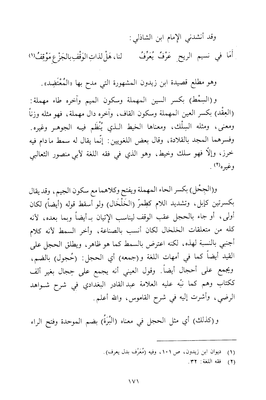 و(السمط) بكسر السين المهملة وسكون الميم وآخره طاء مهملة: (العقد) بكسر العين المهملة وسكون القاف, وآخره دال مهملة, فهو مثله وزنًا ومعنى, ومثله السلك, ومعناها الخيط الذي ينظم فيه الجوهر وغيره. وفسرهما المجد بالقلادة, وقال بعض اللغويين: إنما يقال له سمط ما دام فيه خرز, وإلا فهو سلك وخيط, وهو الذي في فقه اللغة لأبي منصور الثعالبي وغيره.