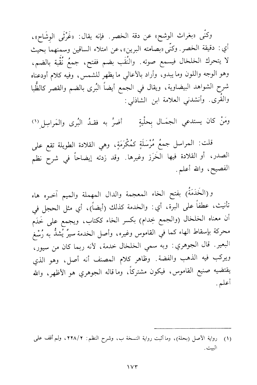 وكنى «بغراث الوشح» عن دقة الخصر. فإنه يقال: «غرثى الوشاح» , أي: دقيقة الخصر. وكنى «بصامته البرين» , عن امتلاء الساقين وسمنهما بحيث لا يتحرك الخلخال فيسمع صوته. والنقب بضم ففتح, جمع نقبة بالضم, وهو الوجه واللون وما يبدو, وأراد بالأعالي ما يظهر للشمس, وفيه كلام أودعناه شرح الشواهد البيضاوية, ويقال في الجمع أيضًا البرى بالضم والقصر كالظبا والقرى. وأنشدني العلامة ابن الشاذلي: