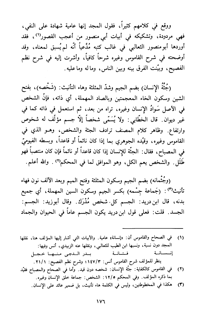 ووقع في كلامهم كثيرًا, فقول المجد إنها عامية شهادة على النفسي, فهي مردودة, وتشكيكه في أبيات أبي منصور من أعجب القصور, فقد أوردها أبو منصور الثعالبي في غالب كتبه مدعيًا أنه لم يسبق لمعناه, وقد أوضحته في شرح القاموس وغيره شرحًا كافيًا, وأشرت إليه في شرح نظم الفصيح, وبينت الفرق بينه وبين الناس, وما له وما عليه.