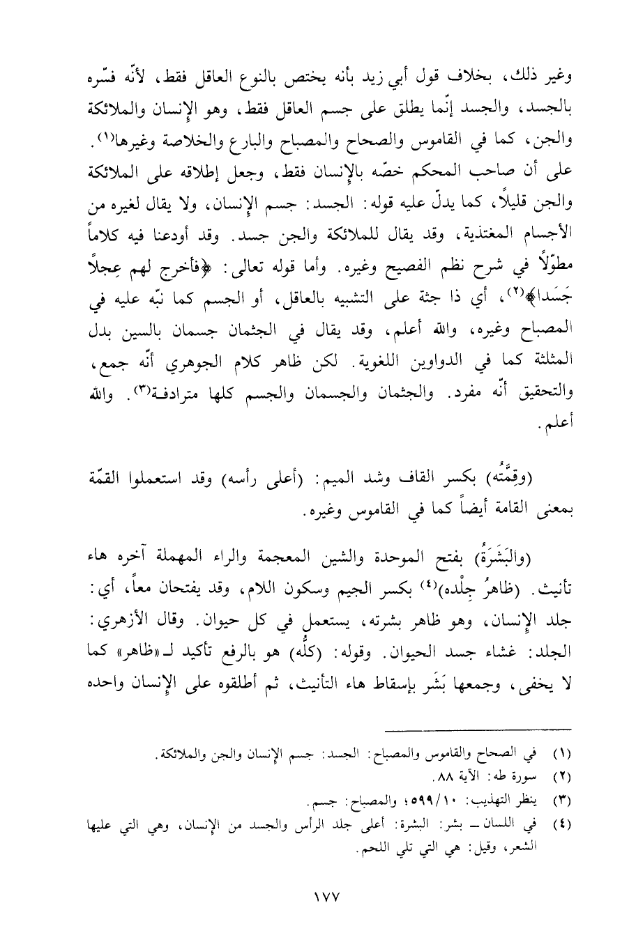 وغير ذلك, بخلاف قول أبي زيد بأنه يختص بالنوع العاقل فقط, لأنه فسره بالجسد, والجسد إنما يطلق على جسم العاقل فقط, وهو الإنسان والملائكة والجن, كما في القاموس والصحاح والمصباح والبارع والخلاصة وغيرها. على أن صاحب المحكم خصه بالإنسان فقط, وجعل إطلاقه على الملائكة والجن قليلًا, كما يدل عليه قوله: الجسد: جسم الإنسان, ولا يقال لغيره من الأجسام المغتذية, وقد يقال للملائكة والجن جسد. وقد أودعنا فيه كلامًا مطولًا في شرح نظم الفصيح وغيره. وأما قوله تعالى: {فأخرج لهم عجلًا جسدًا} , أي ذا جثة على التشبيه بالعاقل, أو الجسم كما نبه عليه في المصباح وغيره, والله أعلم, وقد يقال في الجثمان جسمان بالسين بدل المثلثة كما في الدواوين اللغوية. لكن ظاهر كلام الجوهري أنه جمع, والتحقيق أنه مفرد. والجثمان والجسمان والجسم كلها مترادفة. والله أعلم.