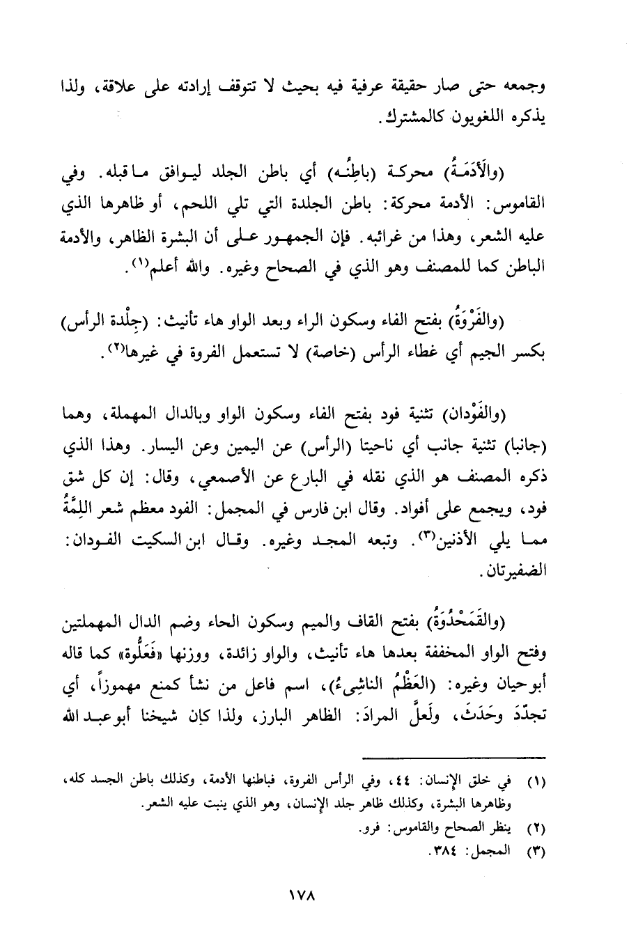 (والفروة) بفتح الفاء وسكون الراء وبعد الواو هاء تأنيث: (جلدة الرأس) بكسر الجيم أي غطاء الرأس (خاصة) لا تستعمل الفروة في غيرها.