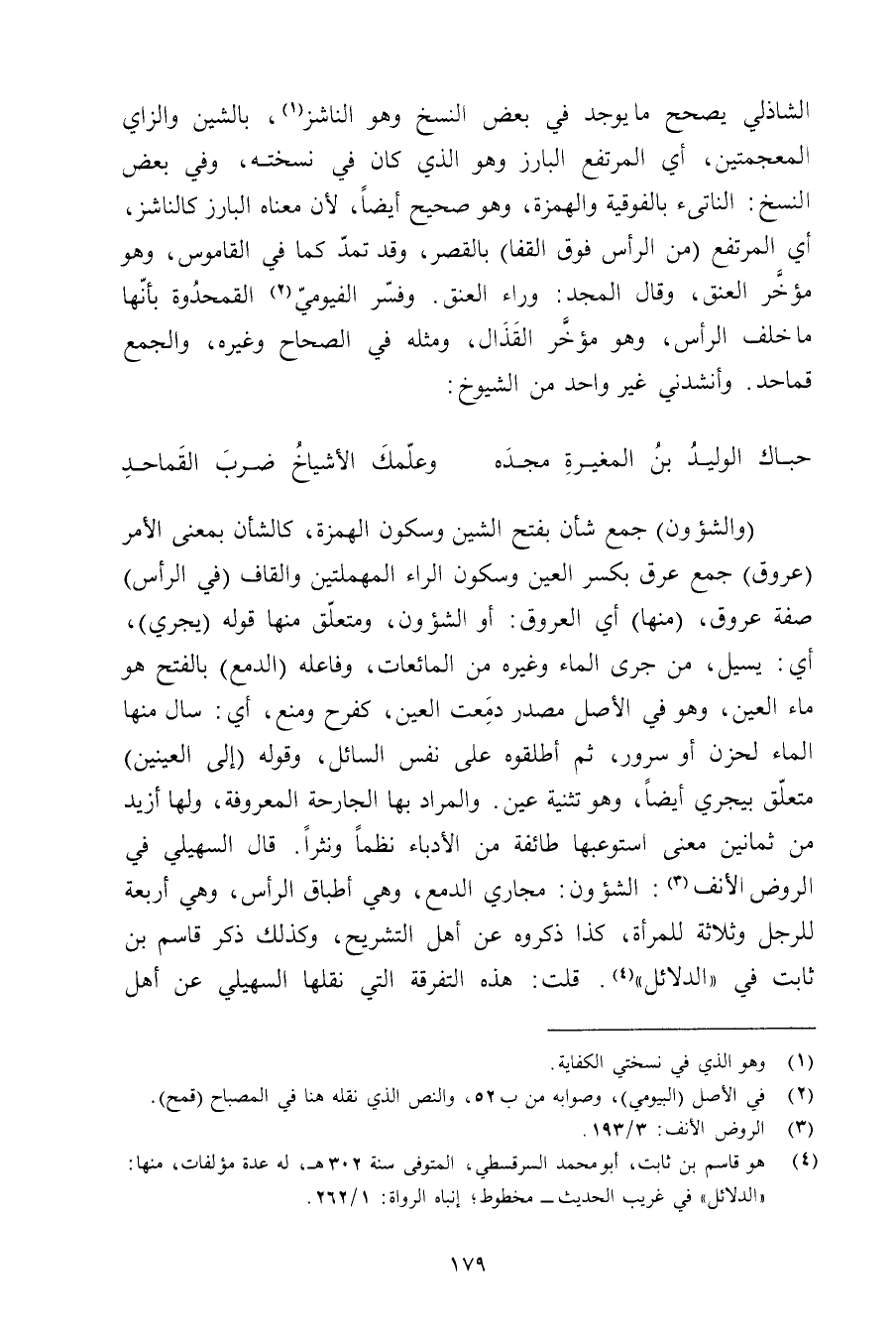 الشاذلي يصحح ما يوجد في بعض النسخ وهو الناشز. بالشين والزاي المعجمتين, أي المرتفع البارز وهو الذي كان في نسخته, وفي بعض النسخ: الناتئ بالفوقية والهمزة, وهو صحيح أيضًا, لأن معناه البارز كالناشز, أي المرتفع (من الرأس فوق القفا) بالقصر, وقد تمد كما في القاموس, وهو مؤخر العنق, وقال المجد: وراء العنق. وفسر الفيومي القمحدوة بأنها ما خلف الرأس, وهو مؤخر القذال, ومثله في الصحاح وغيره, والجمع قماحد. وأنشدني غير واحد من الشيوخ: