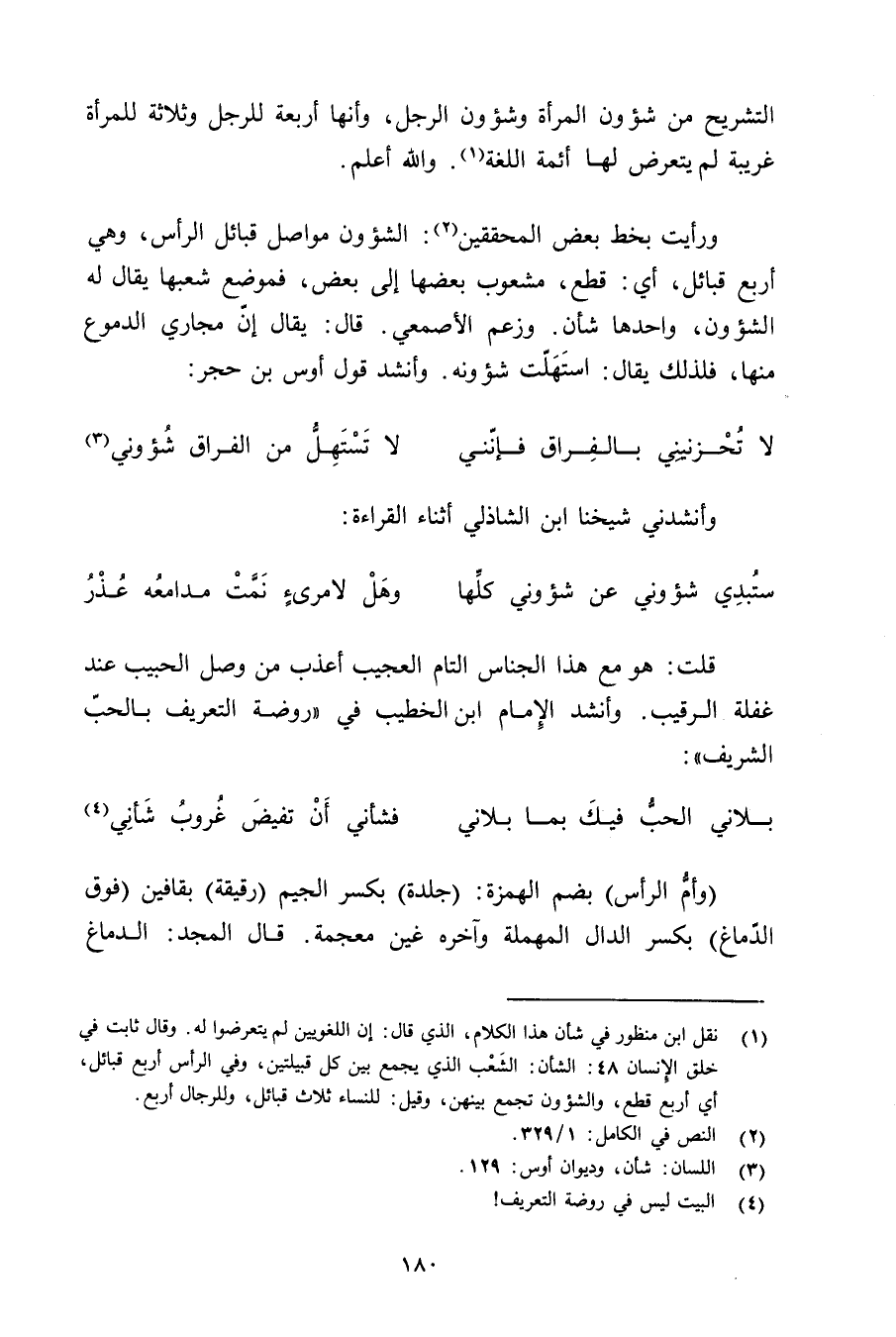 ورأيت بخط بعض المحققين: الشؤون مواصل قبائل الرأس, وهي أربع قبائل, أي: قطع, مشعوب بعضها إلى بعض, فموضع شعبها يقال له الشؤون, واحدها شأن. وزعم الأصمعي. قال: يقال إن مجاري الدموع منها, فذلك يقال: استهلت شؤونه. وأنشد قول أوس بن حجر: