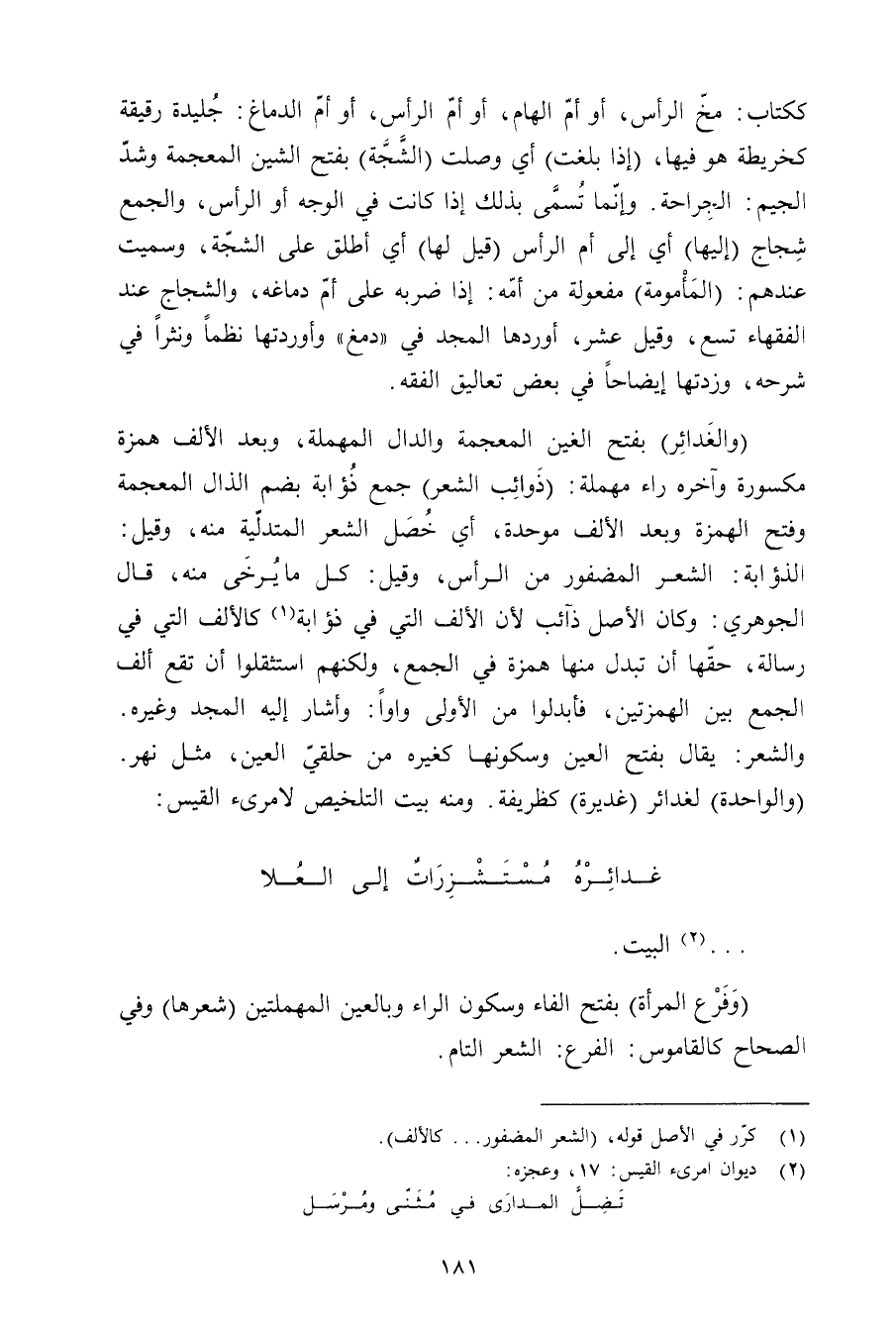 (والغدائر) بفتح الغين المعجمة والدال المهملة, وبعد الألف همزة مكسورة وآخره راء مهملة: (ذوائب الشعر) جمع ذؤابة بضم الذال المعجمة وفتح الهمزة وبعد الألف موحدة, أي خصل الشعر المتدلية منه, وقيل: الذؤابة: الشعر المضفور من الرأس, وقيل: كل ما يرخى منه, قال الجوهري: وكان الأصل ذآئب لأن الألف التي في ذؤابة كالألف التي في رسالة, حقها أن تبدل منها همزة في الجمع, ولكنهم استثقلوا أن تقع ألف الجمع بين الهمزتين, فأبدلوا من الأولى واوًا: وأشار إليه المجد وغيره. والشعر: يقال بفتح العين وسكونها كغيره من حلقي العين, مثل نهر. (والواحدة) لغدائر (غديرة) كظريفة. ومنه بيت التلخيص لامرئ القيس:
