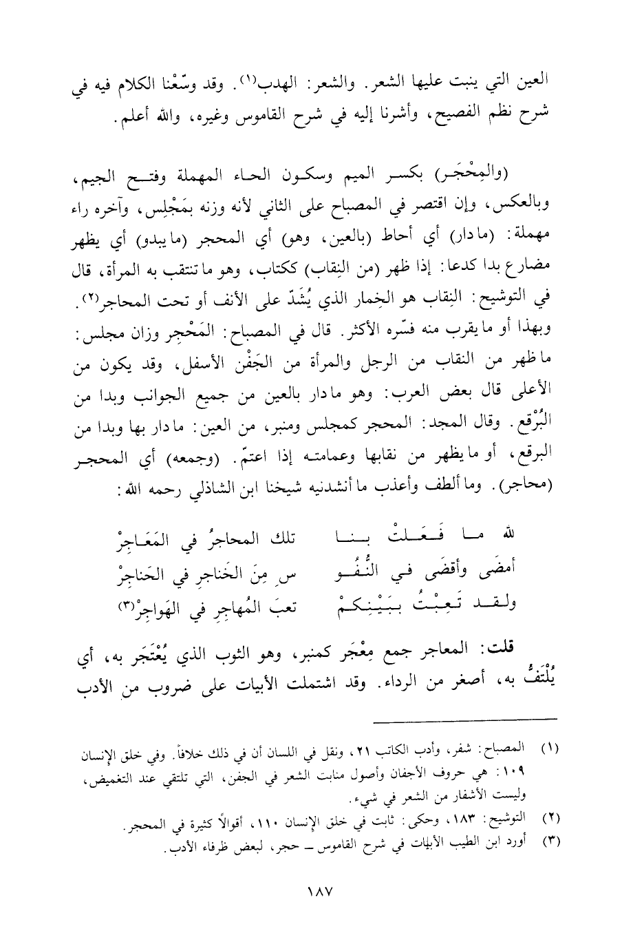 (والمحجر) بكسر الميم وسكون الحاء المهملة وفتح الجيم, وبالعكس, وإن اقتصر في المصباح على الثاني لأنه وزنه بمجلس, وآخره راء مهملة: (ما دار) أي أحاط (بالعين, وهو) أي المحجر (ما يبدوا) أي يظهر مضارع بدا كدعا: إذا ظهر (من النقاب) ككتاب, وهو ما تنتقب به المرأة, قال في التوشيح: النقاب هو الخمار الذي يشد على الأنف أو تحت المحاجر. وبهذا أو ما يقرب منه فسره الأكثر. قال في المصباح: المحجر وزان مجلس: ما ظهر من النقاب من الرجل والمرأة من الجفن الأسفل, وقد يكون من الأعلى قال بعض العرب: وهو ما دار بالعين من جميع الجوانب وبدا من البرقع. وقال المجد: المحجر كمجلس ومنبر, من العين: ما دار بها وبدا من البرقع, أو ما يظهر من نقابها وعمامته إذا اعتم. (وجمعه) أي المحجر (محاجر). وما ألطف وأعذ ما أنشدنيه شيخنا ابن الشاذلي رحمه الله: