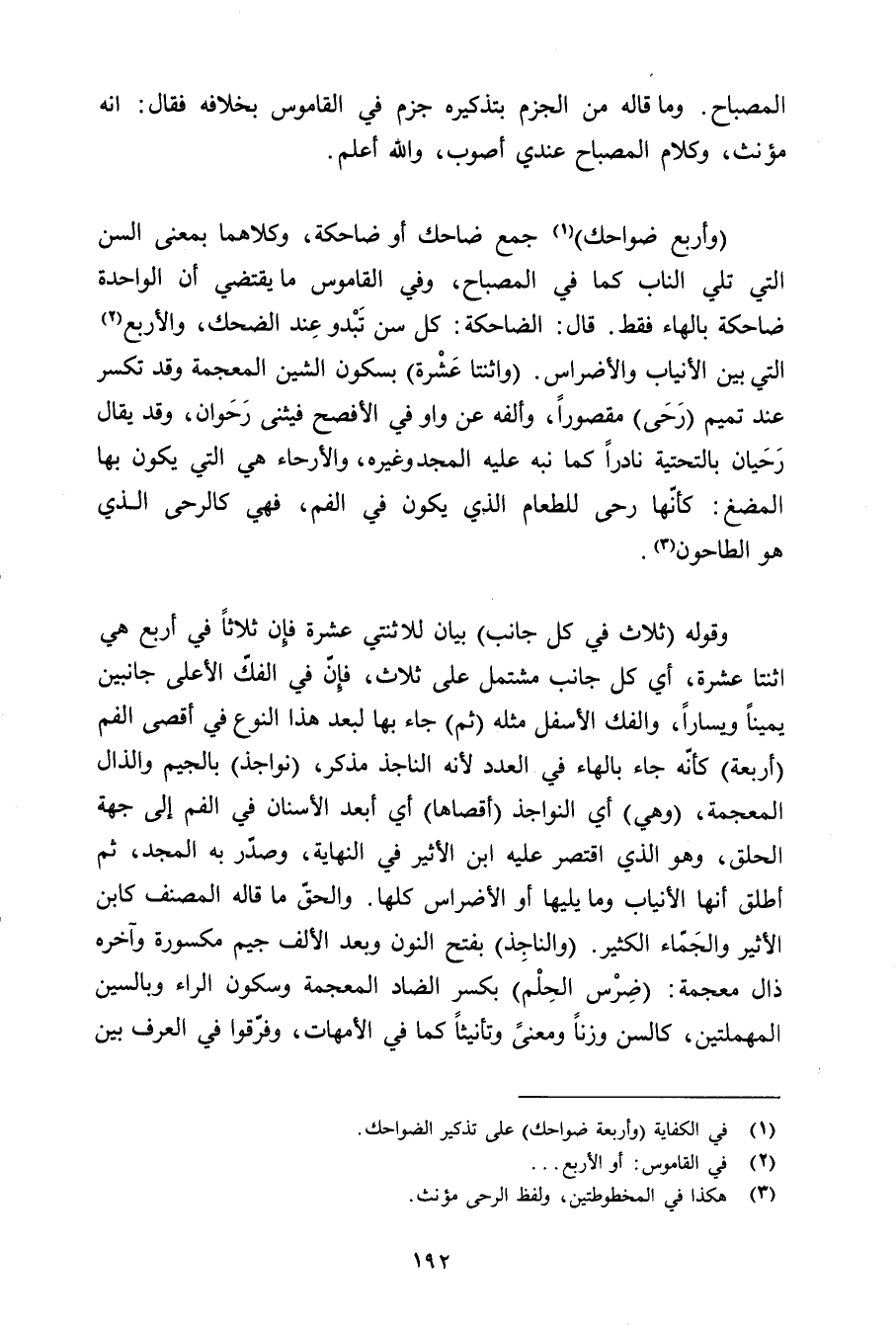(وأربع ضواحك) جمع ضاحك أو ضاحكة, وكلاهما بمعنى السن التي تلي الناب كما في المصباح, وفي القاموس ما يقتضي أن الواحدة ضاحكة بالهاء فقط. قال: الضاحكة: كل سن تبدو عند الضحك, والأربع التي بين الأنياب والأضراس. (واثنتا عشرة) بسكون الشين المعجمة وقد تكسر عند تميم (رحى) مقصورًا, وألفه عن واو في الأفصح فيثنى رحوان, وقد يقال رحيان بالتحتية نادرًا كما نبه عليه المجد وغيره, والأرحاء هي التي يكون بها المضغ: كأنها رحى للطعام الذي يكون في الفم, فهي كالرحى الذي هو الطاحون.
