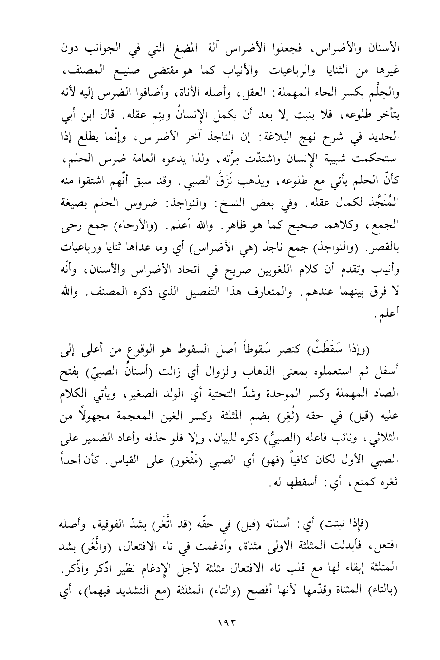 الأسنان والأضراس, فجعلوا الأضراس آلة المضغ التي في الجوانب دون غيرها من الثنايا والرباعيات والأنياب كما هو مقتضى صنيع المصنف, والحلم بكسر الحاء المهملة: العقل, وأصله الأناة, وأضافوا الضرس إليه لأنه يتأخر طلوعه, فلا ينبت إلا بعد أن يكمل الإنسان ويتم عقله. قال ابن أبي الحديد في شرح نهج البلاغة: إن الناجذ آخر الأضراس, وإنما يطلع إذا استحكمت شبية الإنسان واشتدت مرته, ولذا يدعوه العامة ضرس الحلم, كأن الحلم يأتي مع طلوعه, ويذهب نزق الصبي. وقد سبق أنهم اشتقوا منه المنجذ لكمال عقله. وفي بعض النسخ: والنواجذ: ضروس الحلم بصيغة الجمع, وكلاهما صحيح كما هو ظاهر. والله أعلم. (والأرحاء) جمع رحى بالقصر. (والنواجذ) جمع ناجذ (هي الأضراس) أي وما عداها ثنايا ورباعيات وأنياب وتقدم أن كلام اللغويين صريح في اتحاد الأضراس والأسنان, وأنه لا فرق بينهما عندهم. والمتعارف هذا التفصيل الذي ذكره المصنف. والله أعلم.