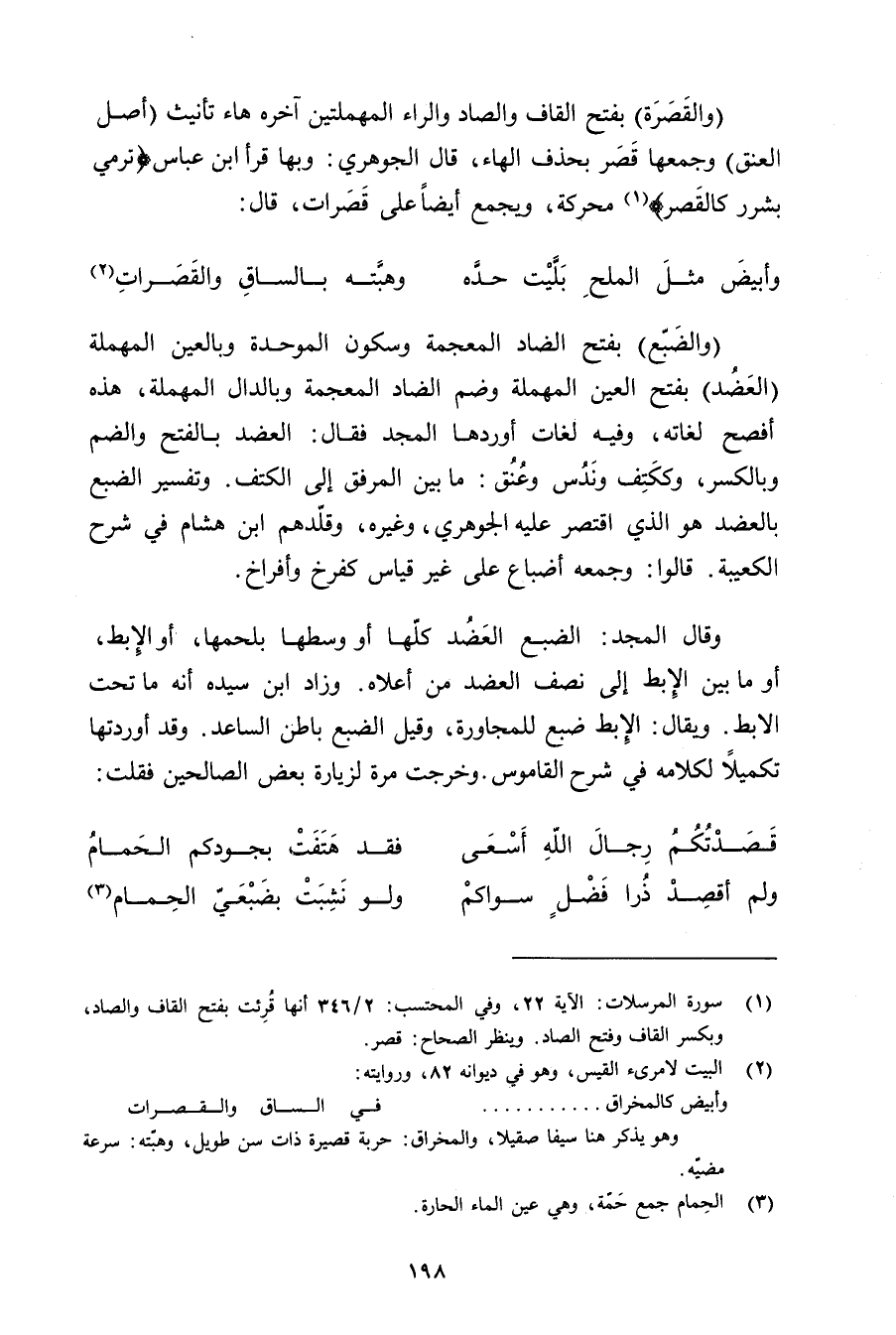 (والضبع) بفتح الضاد المعجمة وسكون الموحدة وبالعين المهملة (العضد) بفتح الضاد المعجمة وسكون الموحدة وبالعين المهملة (العضد) بفتح العين المهملة وضم الضاد المعجمة وبالدال المهملة, هذه أفصح لغاته, وفيه لغات أوردها المجد فقال: العضد بالفتح والضم وبالكسر, وككتف وندس وعنق: ما بين المرفق إلى الكتف. وتفسير الضبع بالعضد هو الذي اقتصر عليه الجوهري, وغيره, وقلدهم ابن هشام في شرح الكعيبة. قالوا: وجمعه أضباع على غير قياس كفرخ وأفراخ.
