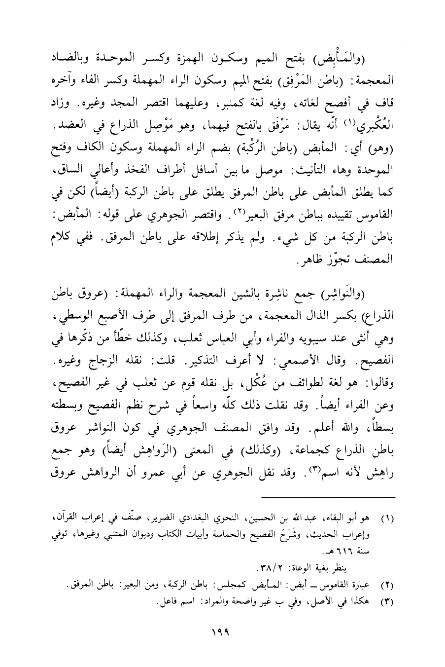 (والمأبض) بفتح الميم وسكون الهمزة وكسر الموحدة وبالضاد المعجمة: (باطن المرفق) بفتح الميم وسكون الراء المهملة وكسر الفاء وآخره قاف في أفصح لغاته, وفيه لغة كمنبر, وعليهما اقتصر المجد وغيره. وزاد العكبري أنه يقال: مرفق بالفتح فيهما, وهو موصل الذراع في العضد. (وهو) أي: المأبض (باطن الركبة) بضم الراء المهملة وسكون الكاف وفتح الموحدة وهاء التأنيث: موصل ما بين أسافل أطراف الفخذ وأعالي الساق, كما يطلق المأبض على باطن المرفق يطلق على باطن الركبة (أيضًا) لكن في القاموس تقييده بباطن مرفق البعير. واقتصر الجوهري على قوله: المأبض: باطن الركبة من كل شيء. ولم يذكر إطلاقه على باطن المرفق. ففي كلام المصنف تجوز ظاهر.