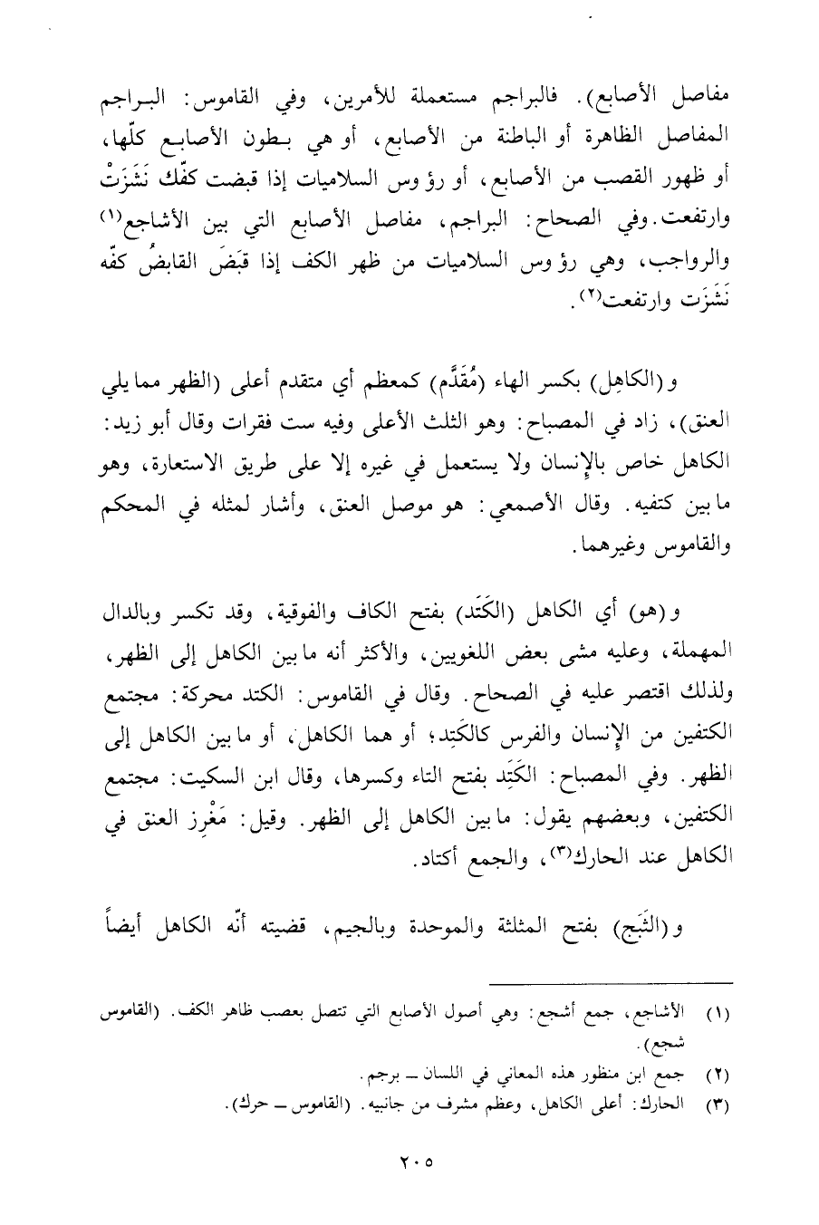 مفاصل الأصابع). فالبراجم مستعملة للأمرين, وفي القاموس: البراجم المفاصل الظاهرة أو الباطنة من الأصابع, أو هي بطون الأصابع كلها, أو ظهور القصب من الأصابع, أو رؤوس السلاميات إذا قبضت كفك نشزت وارتفعت. وفي الصحاح: البراجم, مفاصل الأصابع التي بين الأشاجع والرواجب, وهي رؤوس السلاميات من ظهر الكف إذا قبض القابض كفه نشزت وارتفعت.