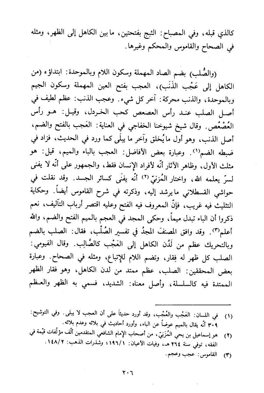 (والصلب) بضم الصاد المهملة وسكون اللام وبالموحدة: ابتداؤه (من الكاهل إلى عجب الذنب) , العجب بفتح العين المهملة وسكون الجيم وبالموحدة, والذنب محركة: آخر كل شيء. وعجب الذنب: عظم لطيف في أصل الصلب عند رأس العصعص كحب الخردل, وقيل: هو رأس العصعص. وقال شيخ شيوخنا الخفاجي في العناية: العجب بالفتح والضم, أصل الذنب, وهو أول ما يخلق وآخر ما يبلى كما ورد في الحديث, فزاد في ضبطه الضم. وعبارة بعض الأفاضل: العجب بالباء والميم, قيل: هو مثلث الأول, وظاهر الآثار أنه لأفراد الإنسان فقط, والجمهور على أنه لا يفنى لسر يعلمه الله, واختار المزني أنه يفنى كسائر الجسد. وقد نقلت في حواشي القسطلاني ما يرشد إليه, وذكرته في شرح القاموس أيضًا. وحكاية التثليث فيه غريب, فإن المعروف فيه الفتح وعليه اقتصر أرباب التآليف, نعم ذكروا أن الباء تبدل ميمًا, وحكى المجد في العجم بالميم الفتح والضم, والله أعلم. وقد وافق المصنف المجد في تفسيره الصلب, فقال: الصلب بالضم وبالتحريك عظم من لدن الكاهل إلى العجب كالصالب. وقال الفيومي: الصلب كل ظهر له فقار, وتضم اللام للإتباع, ومثله في الصحاح. وعبارة بعض المحققين: الصلب, عظم ممتد من لدن الكاهل, وهو فقار الظهر الممتدة فيه كالسلسة, وأصل معناه: الشديد, فسمي به الظهر والعظم