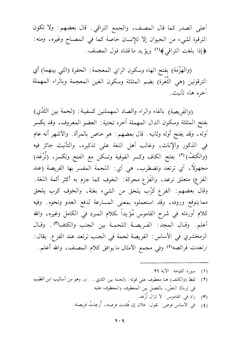 (والفريصة) بالفاء والراء والصاد المهملتين كسفينة: (لحمة بين الثدي) بفتح المثلثة وسكون الدال المهملة آخره تحتية: العضو المعروف, وقد يكسر أوله, وقد يفتح أوله وثانيه. قال بعضهم: هو خاص بالمرأة. والأشهر أنه عام في الذكور والإناث, وغالب أهل اللغة على تذكيره, والتأنيث جائز فيه (والكتف) بفتح الكاف وكسر الفوقية وتسكن مع الفتح وتكسر, (ترعد) مجهولًا, أي ترتعد وتضطرب, هي أي: اللحمة المفسر بها الفريصة (عند الفزع) متعلق ترعد, والفزع محركة: الخوف كما جزم به أكثر أئمة اللغة.