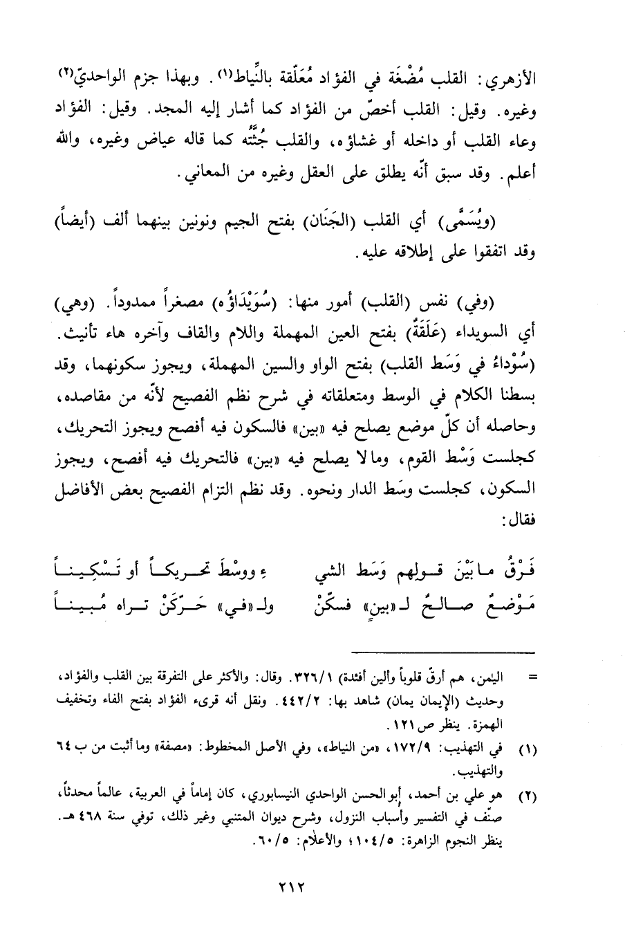 الأزهري: القلب مضغة في الفؤاد معلقة بالنياط. وبهذا جزم الواحدي وغيره. وقيل: القلب أخص من الفؤاد كما أشار إليه المجد. وقيل: الفؤاد وعاء القلب أو داخله أو غشاؤه, والقلب جثته كما قال عياض وغيره, والله أعلم. وقد سبق أنه يطلق على العقل وغيره من المعاني.