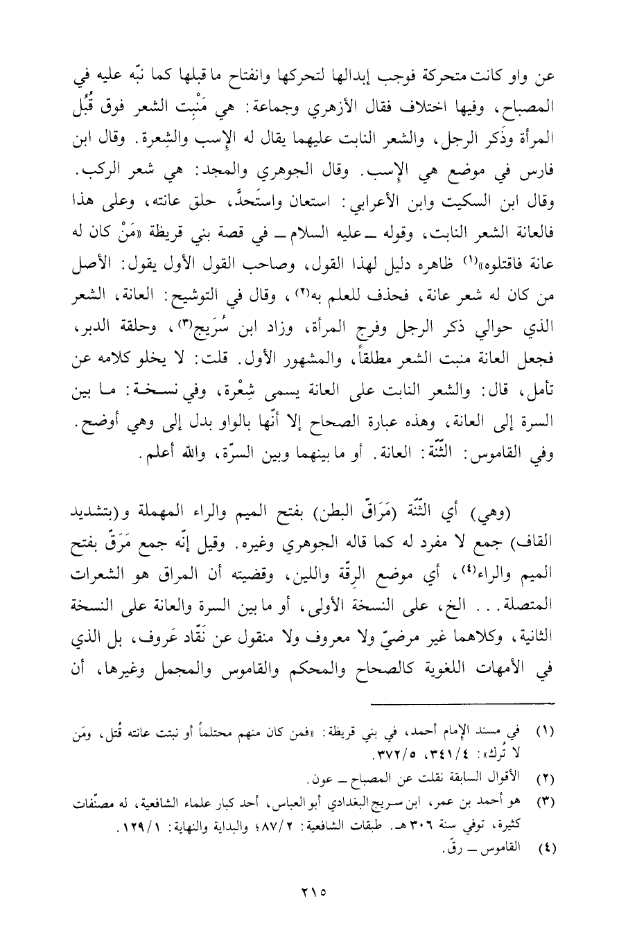 عن واو كانت متحركة فوجب إبدالها لتحركها وانفتاح ما قبلها كما نبه عليه في المصباح, وفيها اختلاف فقال الأزهري وجماعة: هي منبت الشعر فوق قبل المرأة وذكر الرجل, والشعر النابت عليهما يقال له الإسب والشعرة. وقال ابن فارس في موضع هي الإسب. وقال الجوهري والمجد: هي شعر الركب. وقال ابن السكيت وابن الأعرابي: استعان واستحد, حلق عانته, وعلى هذا فالعانة الشعر النابت, وقوله - عليه السلام? في قصة بني قريظة «من كان له عانة فاقتلوه» ظاهره دليل لهذا القول, وصاحب القول الأول يقول: الأصل من كان له شعر عانة, فحذف للعلم به, وقال في التوشيح: العانة, الشعر الذي حوالي ذكر الرجل وفرج المرأة, وزاد ابن سريج, وحلقه الدبر, فجعل العانة منبت الشعر مطلقًا, والمشهور الأول. قلت: لا يخلو كلامه عن تأمل, قال: والشعر النابت على العانة يسمى شعرة, وفي نسخة: ما بين السرة إلى العانة, وهذه عبارة الصحاح إلا أنها بالواو بدل إلى وهي أوضح. وفي القاموس: الثنة: العانة. أو ما بينهما وبين السرة, والله أعلم.