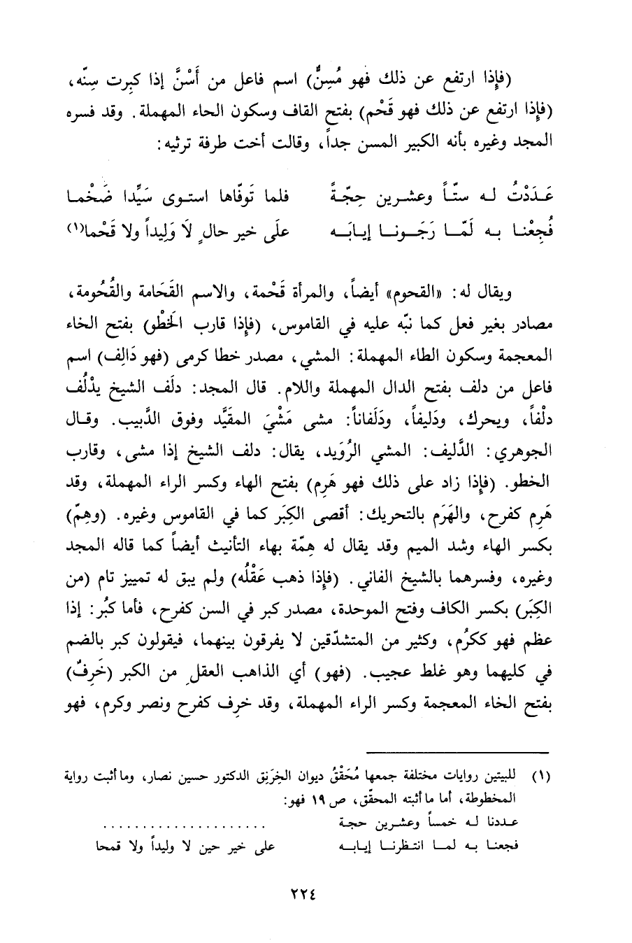 ويقال له: «القحوم» أيضًا, والمرأة قحمة, والاسم القحامة والقحومة, مصادر بغير فعل كما نبه عليه في القاموس, (فإذا قارب الخطو) بفتح الخاء المعجمة وسكون الطاء المهملة: المشي, مصدر خطا كرمى (فهو دالف) اسم فاعل من دلف بفتح الدال المهملة واللام. قال المجد: دلف الشيخ يدلف دلفًا, ويحرك, ودليفًا, ودلفانًا: مشى مشي المقيد وفوق الدبيب. وقال الجوهري: الدليف: المشي الرويد, يقال: دلف الشيخ إذا مشى, وقارب الخطو. (فإذا زاد على ذلك فهو هرم) بفتح الهاء وكسر الراء المهملة, وقد هرم كفرح, والهرم بالتحريك: أقصى الكبر كما في القاموس وغيره. (وهم) بكسر الهاء وشد الميم وقد يقال له همة بهاء التأنيث أيضًا كما قاله المجد وغيره, وفسرهما بالشيخ الفاني. (فإذا ذهب عقله) ولم يبق له تمييز تام (من الكبر) بكسر الكاف وفتح الموحدة, مصدر كبر في السن كفرح, فأما كبر: إذا عظم فهو ككرم, وكثير من المتشدقين لا يفرقون بينهما, فيقولون كبر بالضم في كليهما وهو غلط عجيب. (فهو) أي الذاهب العقل من الكبر (خرف) بفتح الخاء المعجمة وكسر الراء المهملة, وقد خرف كفرح ونصر وكرم, فهو