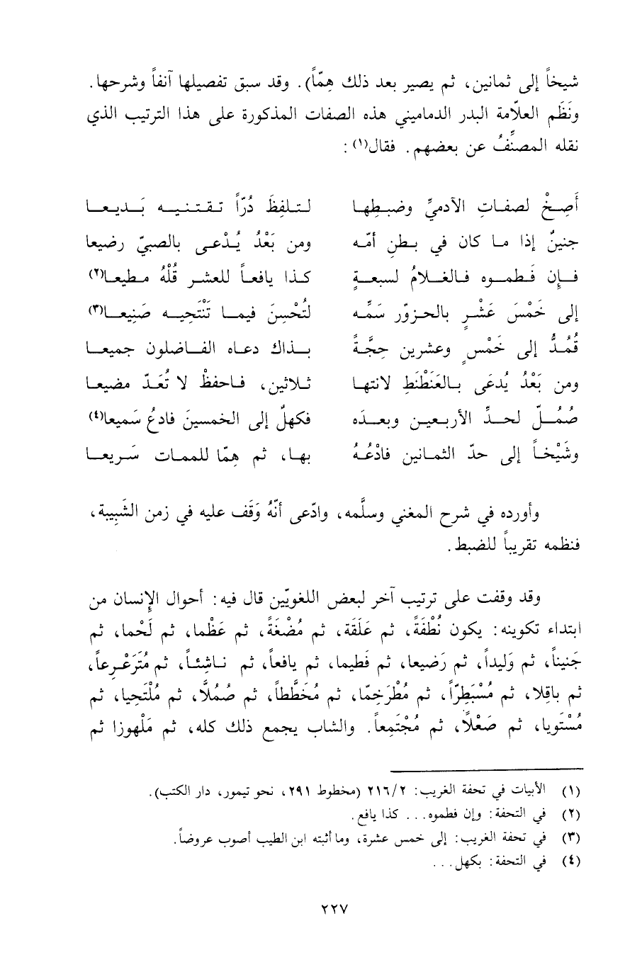 شيخًا إلى ثمانين, ثم يصير بعد ذلك همًا). وقد سبق تفصيلها آنفًا وشرحها. ونظم العلامة البدر الدماميني هذه الصفات المذكورة على هذا الترتيب الذي نقله المصنف عن بعضهم. فقال: