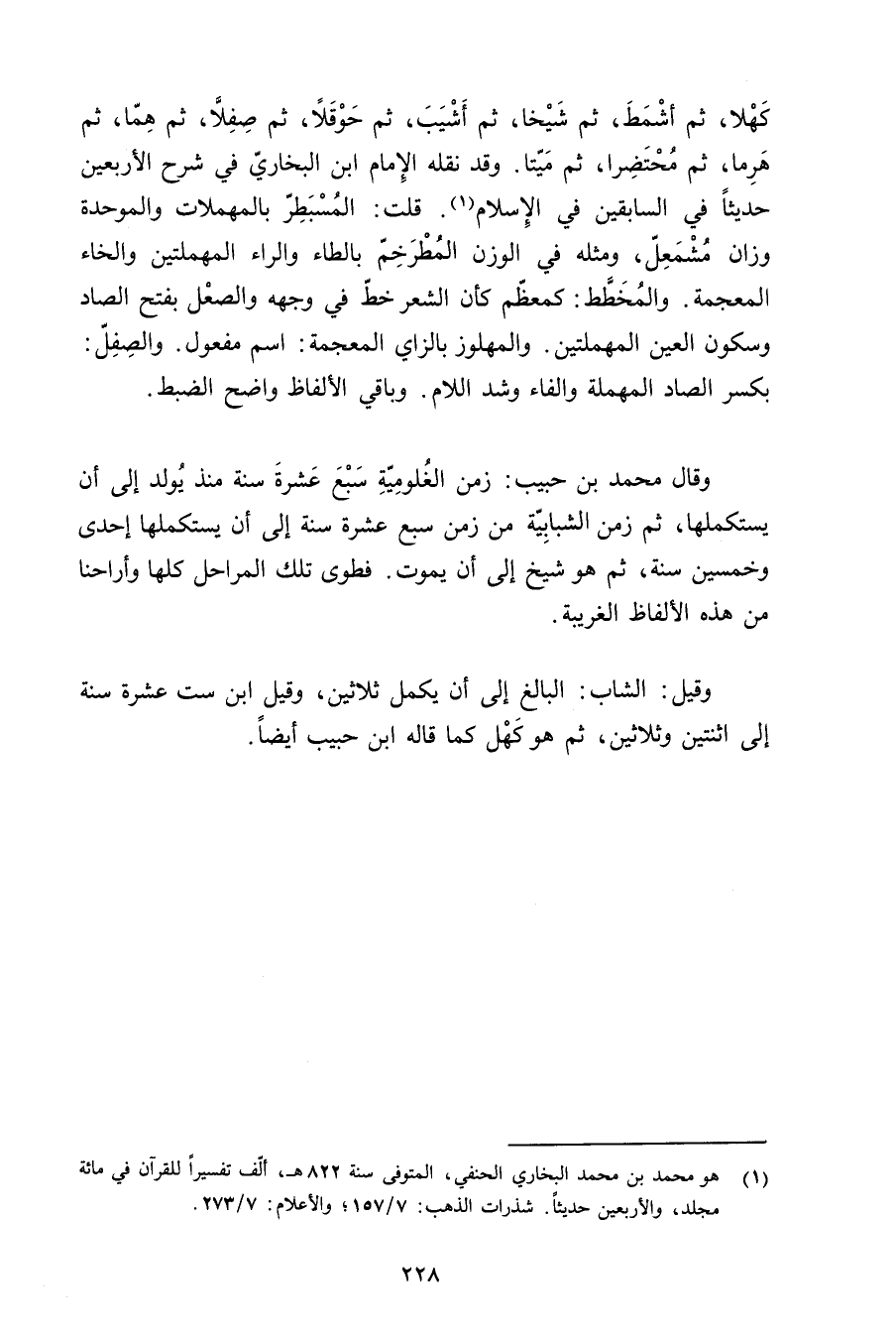 وقال محمد بن حبيب: زمن الغلومية سبع عشرة سنة منذ يولد إلى أن يستكملها, ثم زمن الشبابية من زمن سبع عشرة سنة إلى أن يستكملها إحدى وخمسين سنة, ثم هو شيخ إلى أن يموت. فطوى تلك المراحل كلها وأراحنا من هذه الألفاظ الغربية.